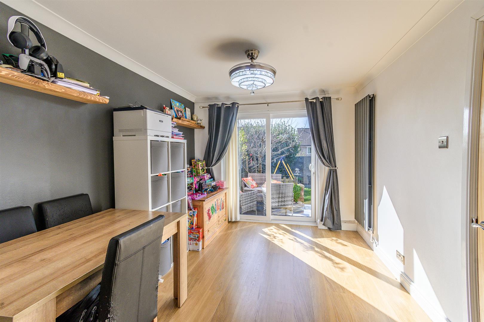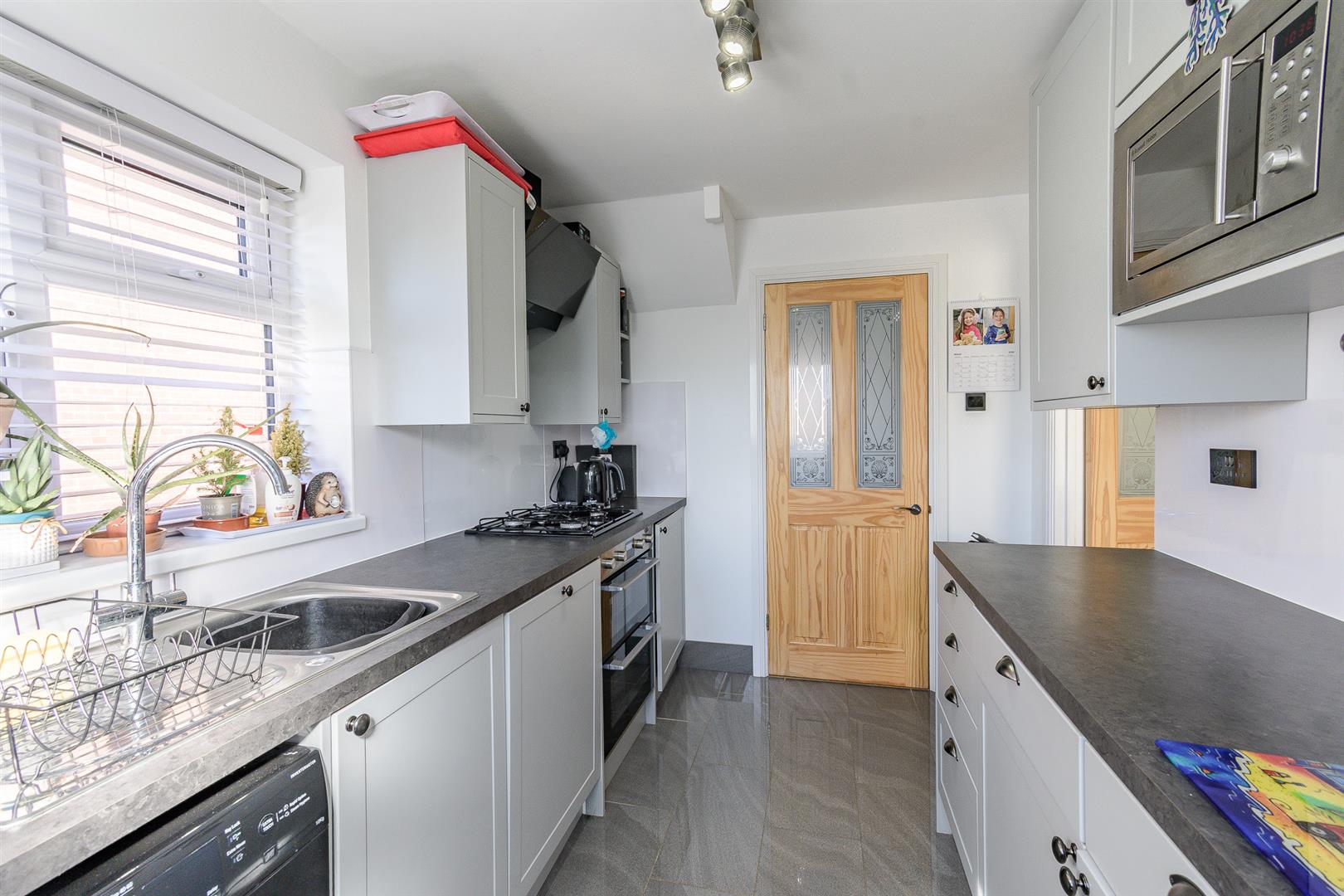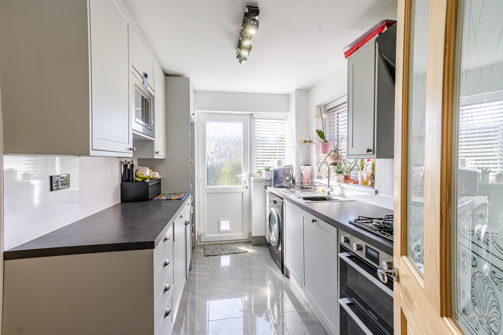Plastered ceiling; plastered walls with splashbacks. High-gloss porcelain tile flooring. UPVC double-glazed window overlooking side aspect; UPVC obscure glass door with side panel to rear garden. Fitted with eye-level and base units; laminate worktops. Integrated microwave; integrated electric oven and grill; inset four-ring gas hob with wall-mounted extractor. Plumbing for washing machine; space for fridge-freezer; integrated dishwasher. Stainless steel sink with mixer tap and drainer. Door to dining room.