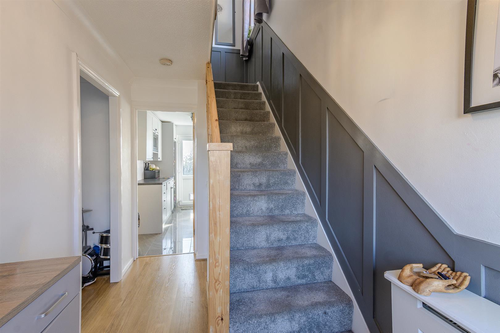 Textured ceiling with coving; plastered walls; wood-effect flooring. Fitted carpeted stairs rising to first floor. Decorative wood panelling; understairs storage cupboards. Doors to living room and kitchen.