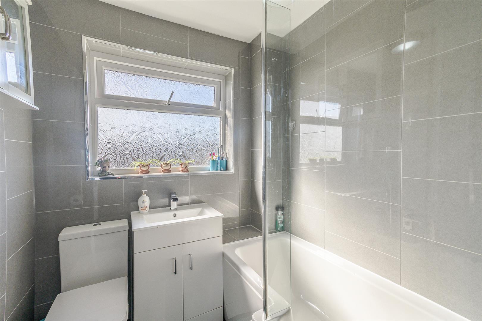 Plastered walls with porcelain aqua panelling; tile-effect gloss splashbacks. Vinyl tile-effect flooring. UPVC double-glazed obscure window overlooking rear aspect. P-shaped bath with glass shower screen; mains-operated shower over and handheld attachment; mixer tap. Close-coupled toilet; vanity wash basin with mixer tap; ceramic sink with storage under. Vertical chrome towel rail.