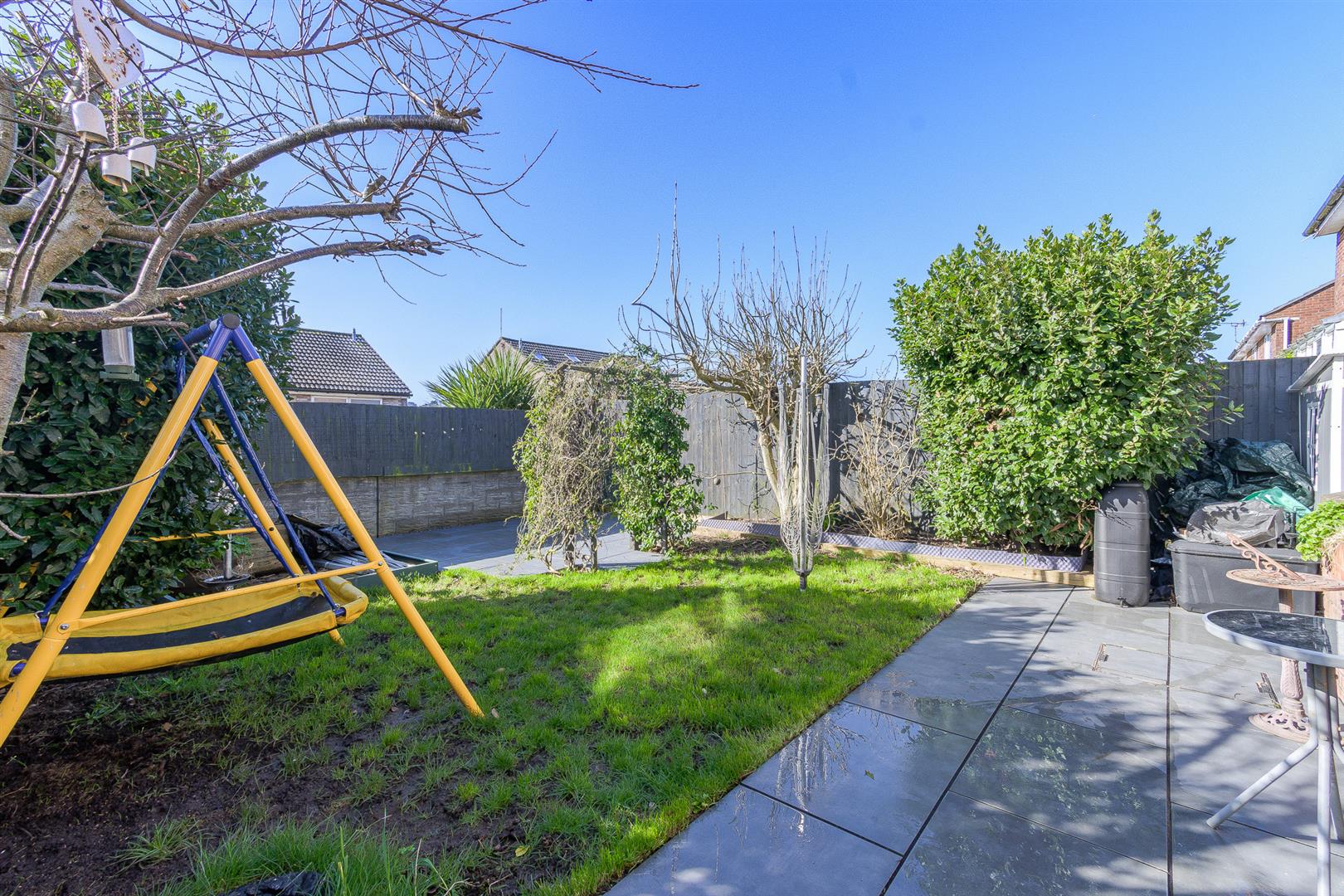 Porcelain-tiled raised patio area with steps descending to further paved porcelain-tile patio and lawn. Timber fencing and brick-built walls enclosing. Raised flowerbeds with mature shrubbery. Space for garden shed. Side access to driveway via wooden gate. Outside lighting and wall-mounted outdoor sockets.