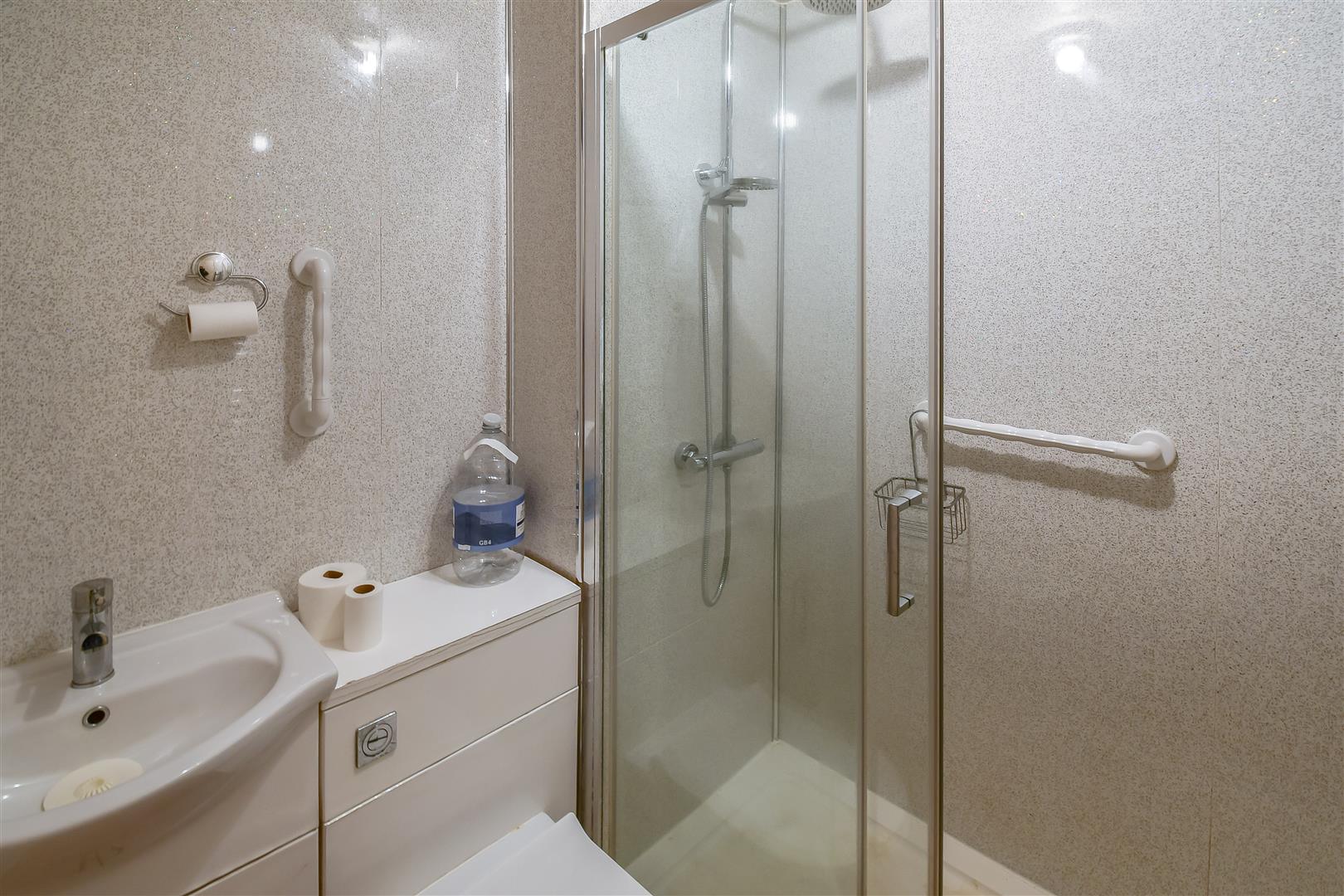 Textured ceiling, PVC panelling to all walls. Vinyl flooring. Double shower cubicle with shower over. Vertical heater. Vanity wash hand basin and w.c. Airing cupboard.