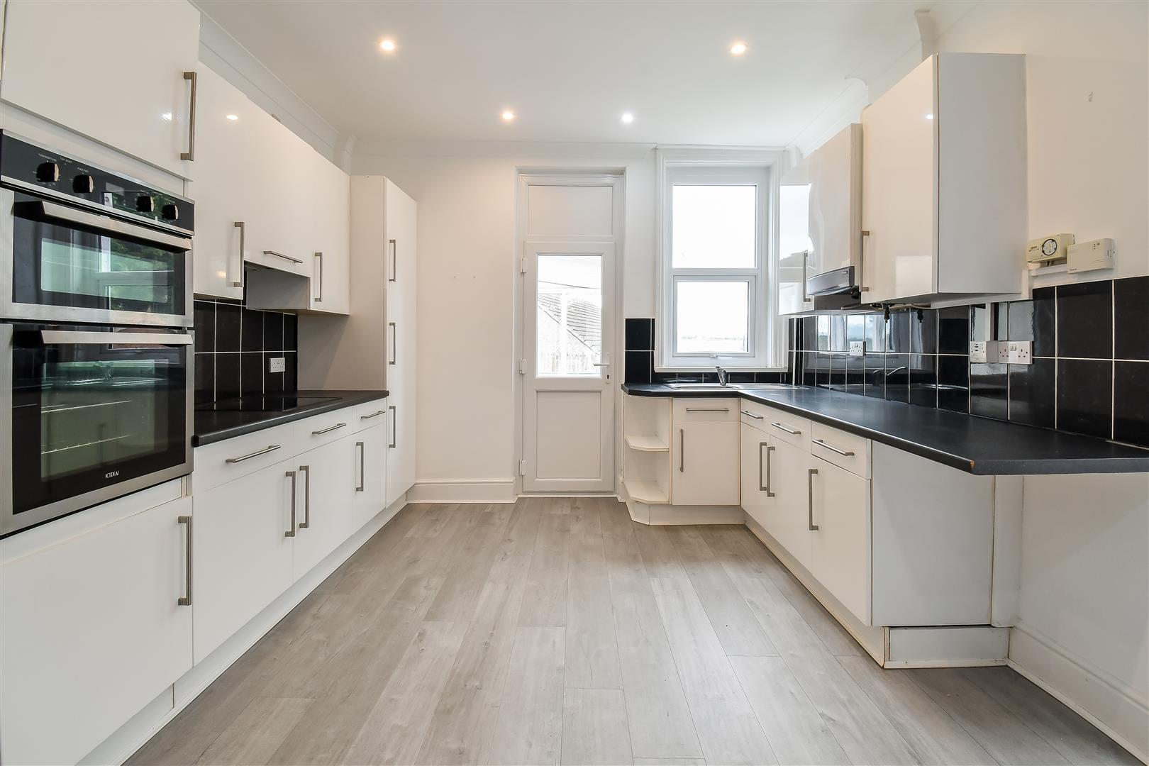 Smoothly plastered ceiling with inset lights and coving, smoothly plastered walls. Wood laminate flooring. Wall mounted radiator. UPVC double glazed window to the side and rear elevations. Fitted kitchen comprising of wall and base units. Wood laminate worktops. Porcelain tiled splashbacks. Integrated induction hob. Integrated double oven. Stainless steel sink. Space for fridge / freezer. Space for washing machine. Wall mounted combination boiler. Ample room for dining furniture. Access to understairs storage. UPVC double glazed door leading through to the rear lobby.