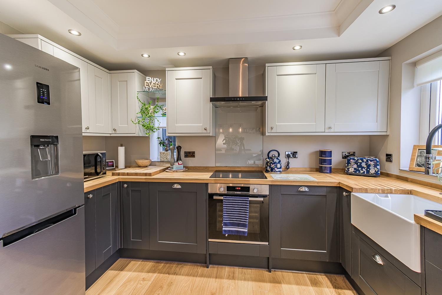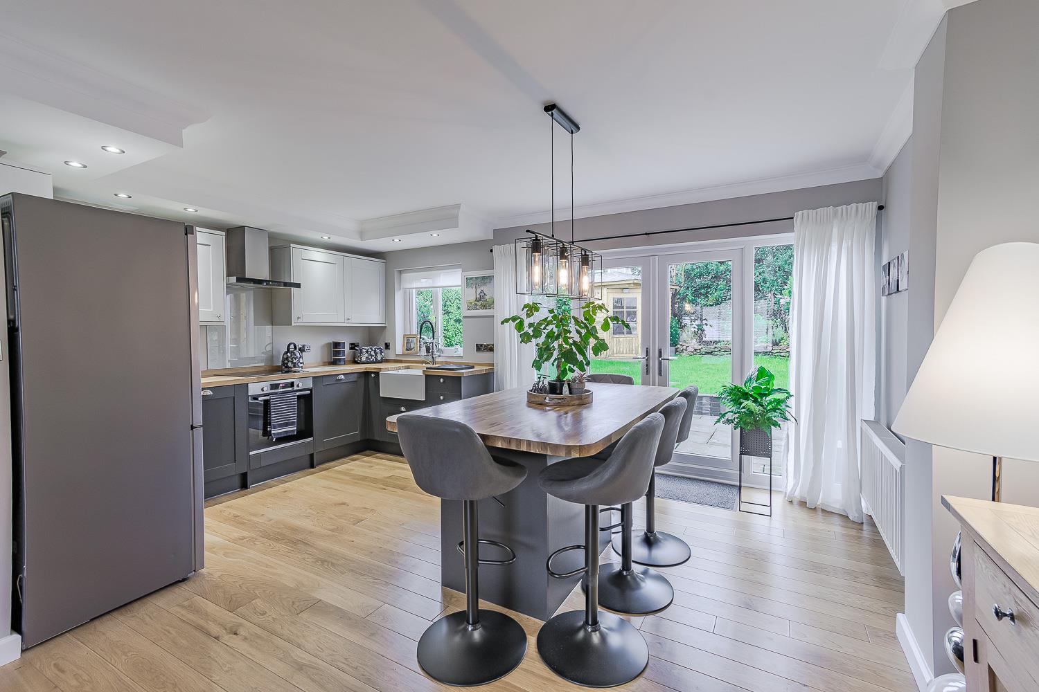 Smoothly plastered ceiling with coving and inset lights, smoothly plastered walls, engineered oak wood flooring, wall mounted radiator. UPVC double glazed patio door to rear garden. UPVC double glazed window with obscured glass to the side elevation. UPVC double glazed window to the rear elevation. Shaker style Howden's kitchen, comprising of wall and base units, solid oak worktops. Integrated hob, integrated oven, stainless steel cooker hood, integrated dishwasher. Integrated washer dryer. Belfast sink with waste disposal and mixer tap with spray hose facility. Space for fridge freezer. Central island with storage and space for dining. Wooden door leading to W.C. Cloakroom.