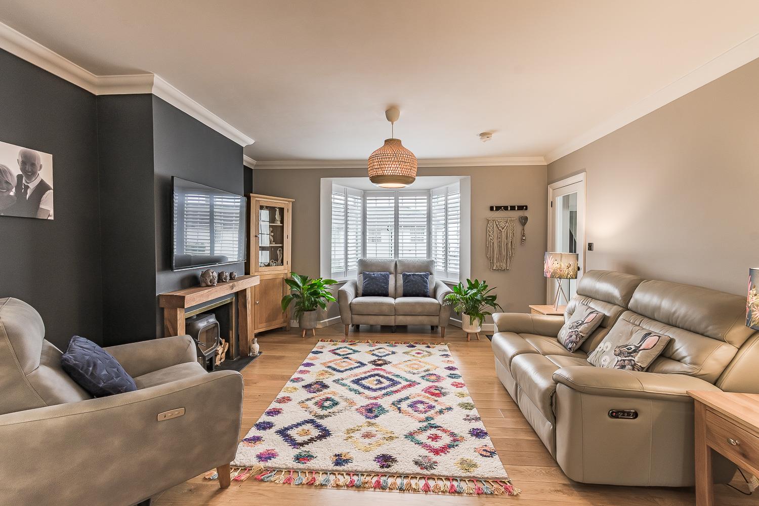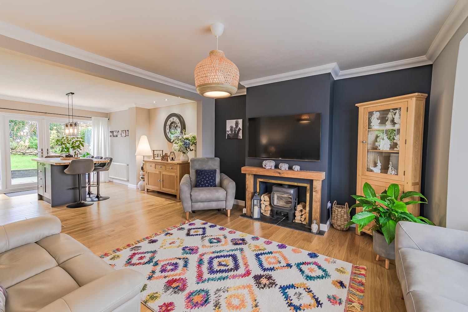 Smoothly plastered ceiling with coving, smoothly plastered walls, engineered oak wood flooring, wall mounted radiator. UPVC double glazed bay fronted window with fitted shutter blinds to the front elevation. Feature fireplace with log burner. Through to dining area and kitchen.