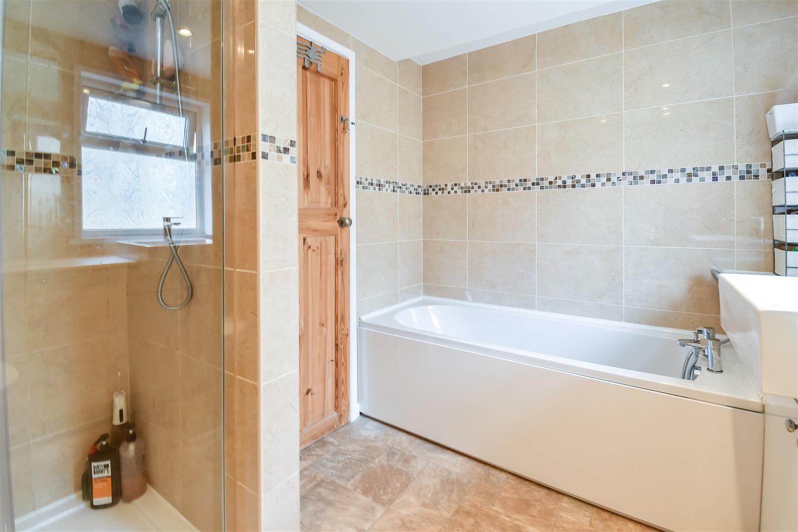 Smoothly plastered ceiling with inset lights, porcelain tiled walls. Vinyl flooring. Wall mounted towel rail. UPVC double glazed window with obscured glass to the side. Double shower with thermostatically controlled shower overhead. Vanity wash hand basin and toilet. Bath. Wood panel door leading through to the first floor landing.