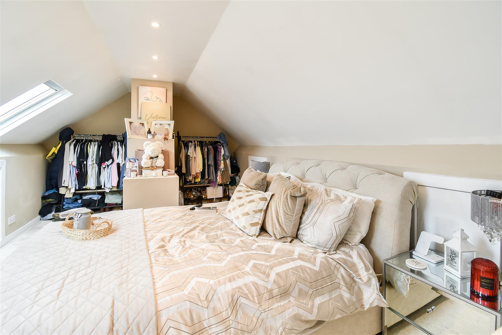 Smoothly plastered ceiling with inset lights and Velux windows, smoothly plastered walls with access to eaves storage. Fitted carpet flooring. Wall mounted radiator. Fitted carpet staircase descending to bedroom three.