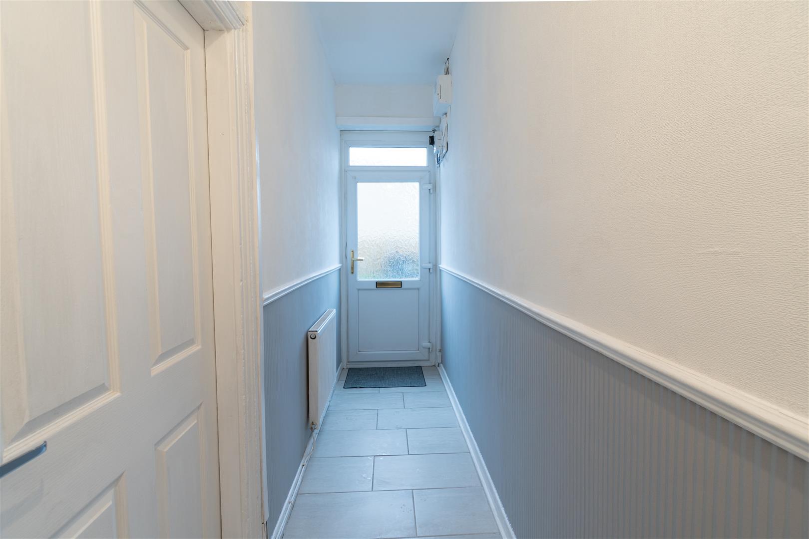 Plastered ceiling, papered walls with dado rails. Tiled flooring. UPVC double glazed obscured glass front door. Wall mounted radiator. Wooden doors opening to living room and dining room.