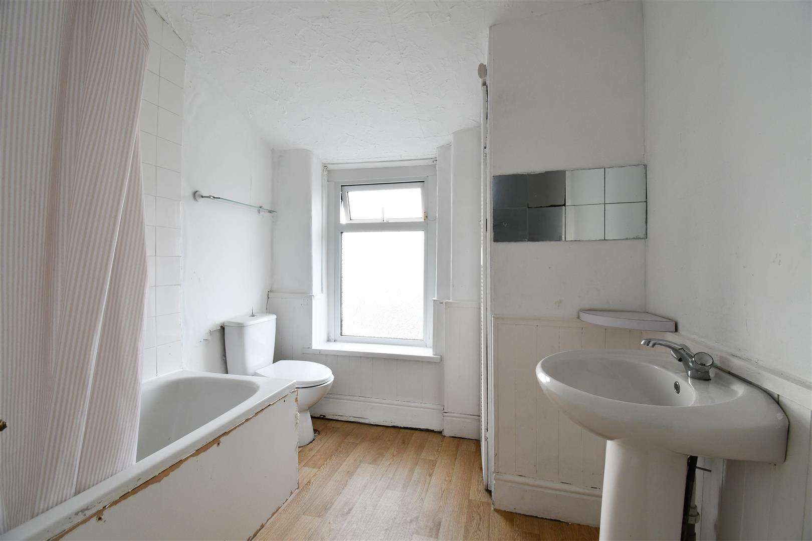 Textured ceiling, plastered walls - part wood panelled. Vinyl flooring. Wall mounted radiator. UPVC double glazed window with obscured glass to the rear elevation. Bath with electric shower overhead. Pedestal wash hand basin. Close coupled toilet. Access to boiler cupboard with wall mounted combination boiler. Wood panelled door leading through to the first floor landing.