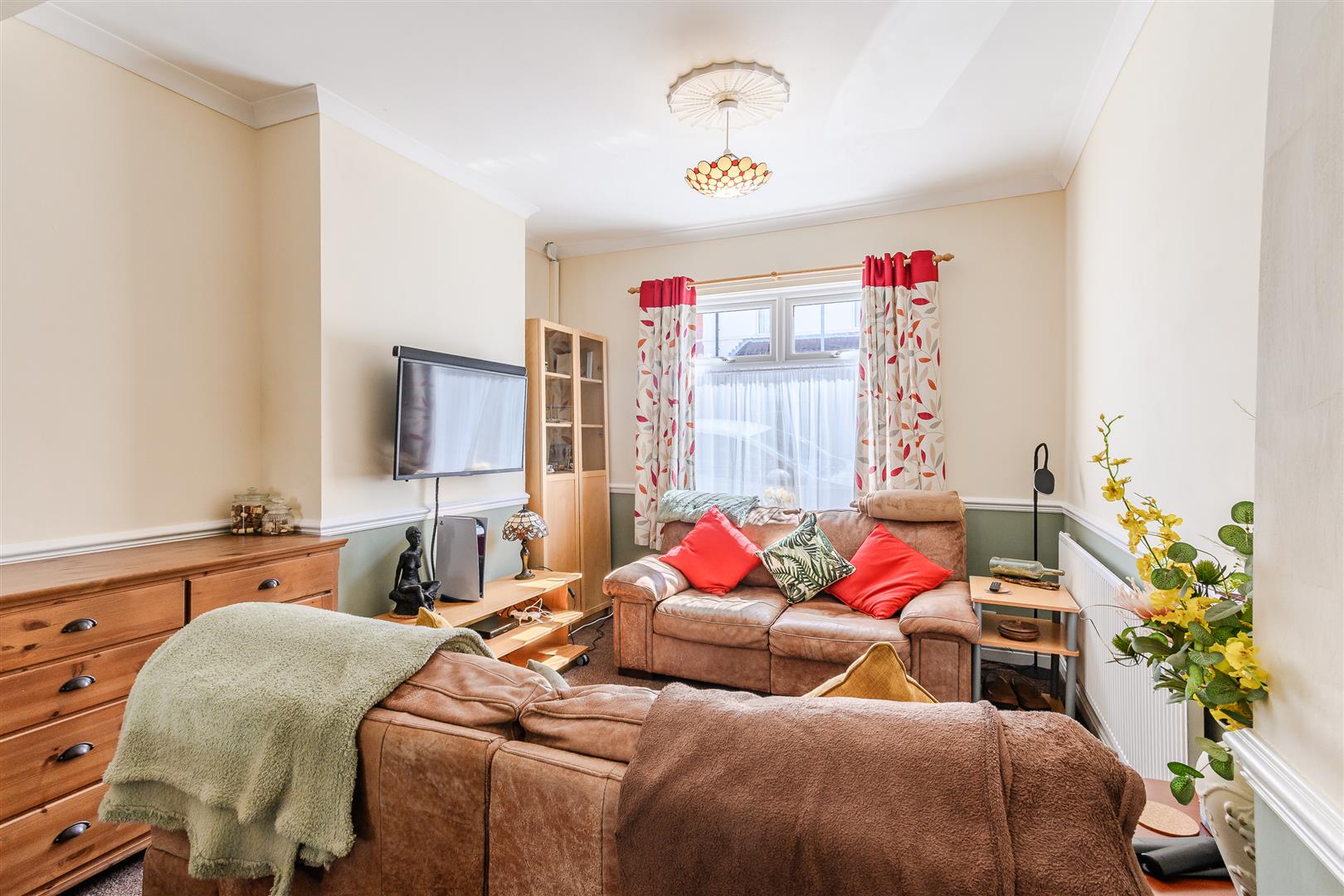 Plastered ceiling; papered walls with tile detailing. Doorway opens to entrance hallway. Papered ceiling and walls to hallway; fitted carpet flooring. Wall-mounted radiator. Carpeted stairs to first floor. Wooden door to through living and dining area.