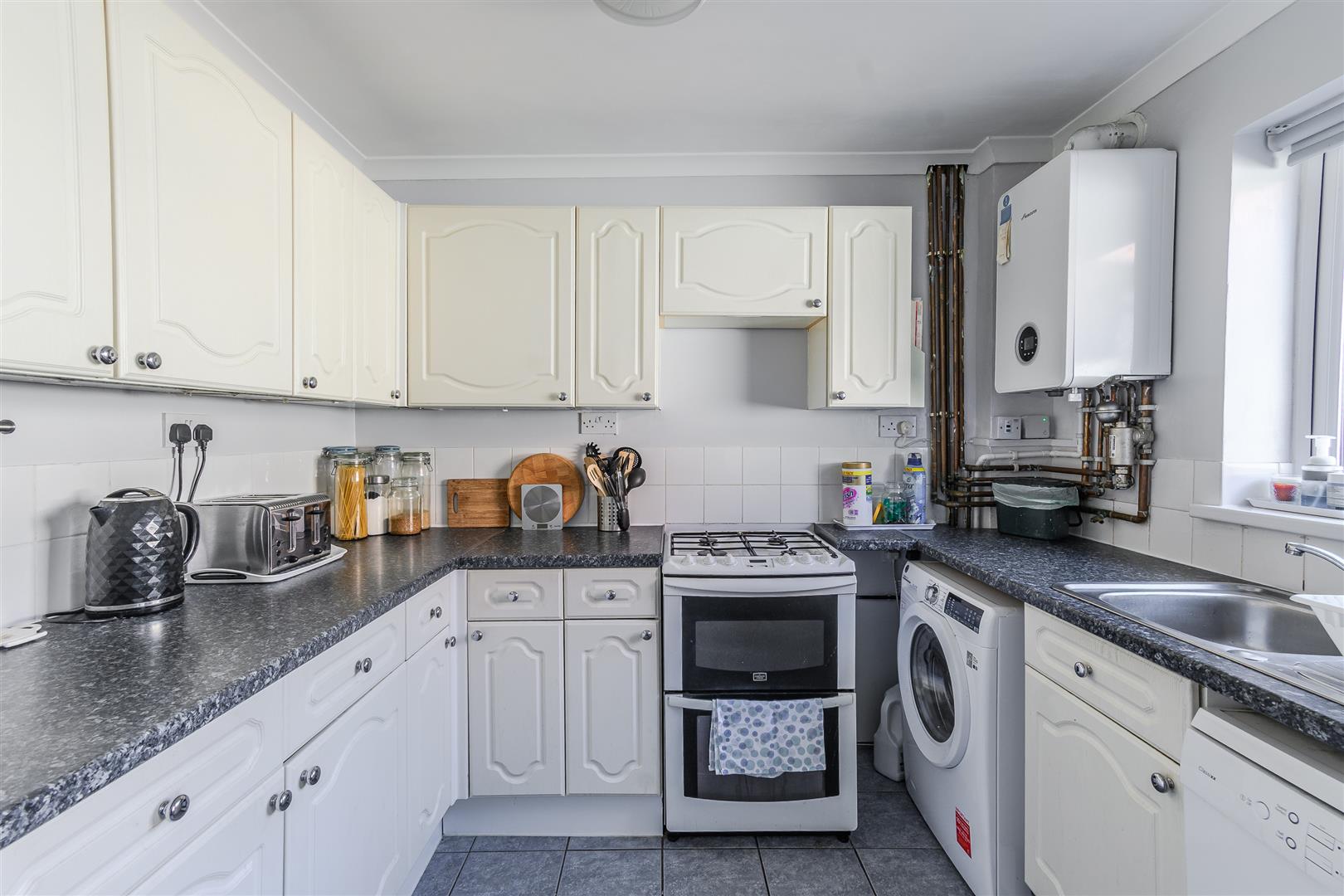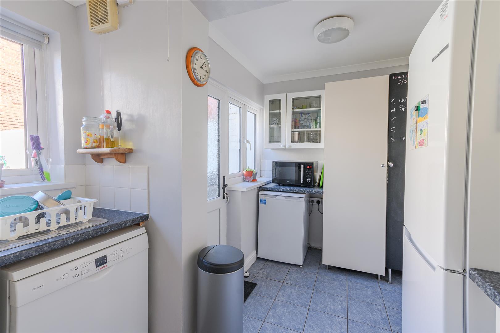 Plastered ceiling with coving; plastered walls with ceramic tiles. Ceramic tile flooring. UPVC double-glazed windows and door to rear garden. Eye-level wall units and base units; laminate work surfaces. Plumbing for washing machine and dishwasher. Space for gas cooker. Stainless steel sink with mixer tap and drainer. Wall-mounted Worcester combination boiler. Space for fridge-freezer and under-counter fridge.