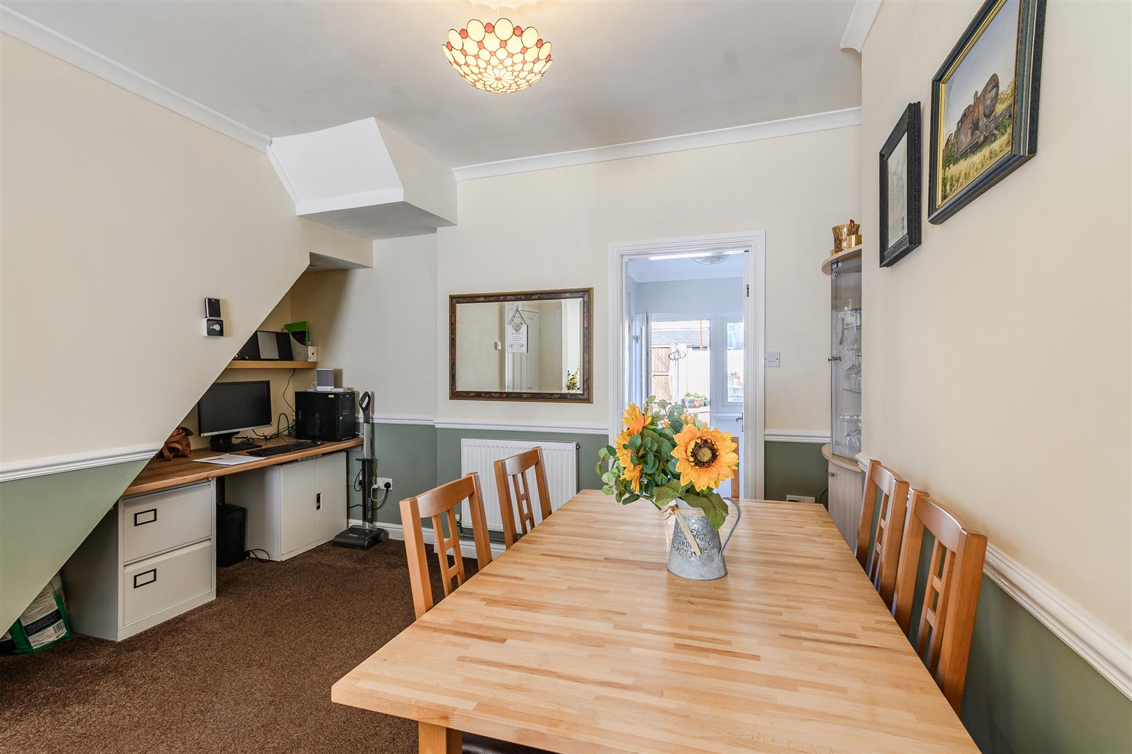 Plastered ceiling with coving; plastered walls with dado rails. Fitted carpet flooring. UPVC double-glazed window to front aspect. Wall-mounted radiator. Under-stairs area with wall-mounted shelving; space for office. Space for large dining suite. Door with step down to kitchen and utility.