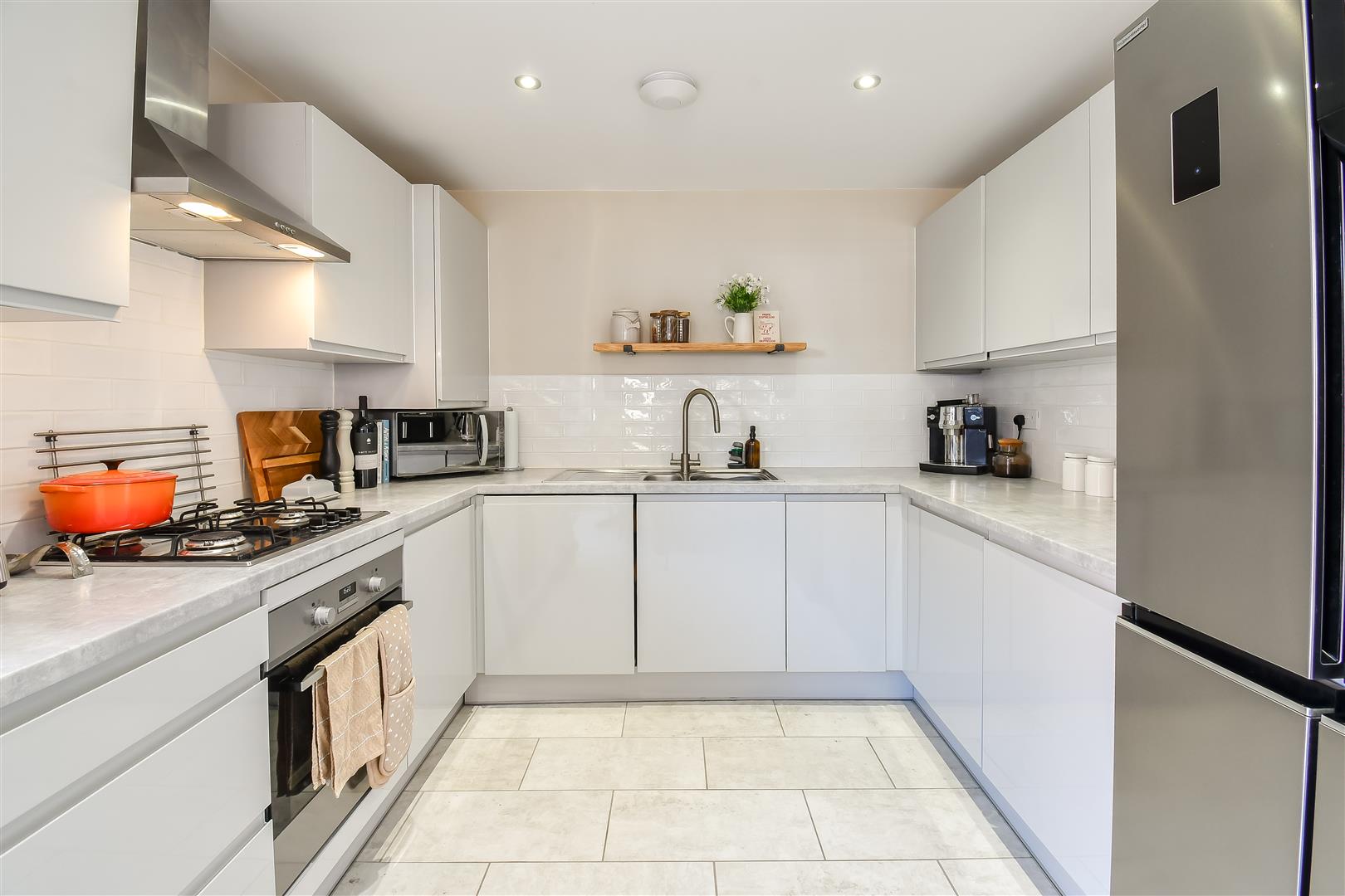 Smoothly plastered ceiling with vent extractor, smoothly plastered walls. Porcelain tiled splashback's, Ceramic tiled flooring. Wall mounted radiator. UPVC double glazed window to the front elevation. UPVC double glazed French doors leading to an enclosed rear garden. A high gloss fitted kitchen, comprising of wall and base units. Wood laminate worktops. Stainless steel 1 1/2 bowl sink. Integrated four ring gas hob, integrated oven. Stainless steel cooker hood. Integrated washing machine. Space for American fridge / freezer. Enclosed wall mounted combination boiler. Ample room for dining furniture. Wood framed door leading to the entrance hallway.