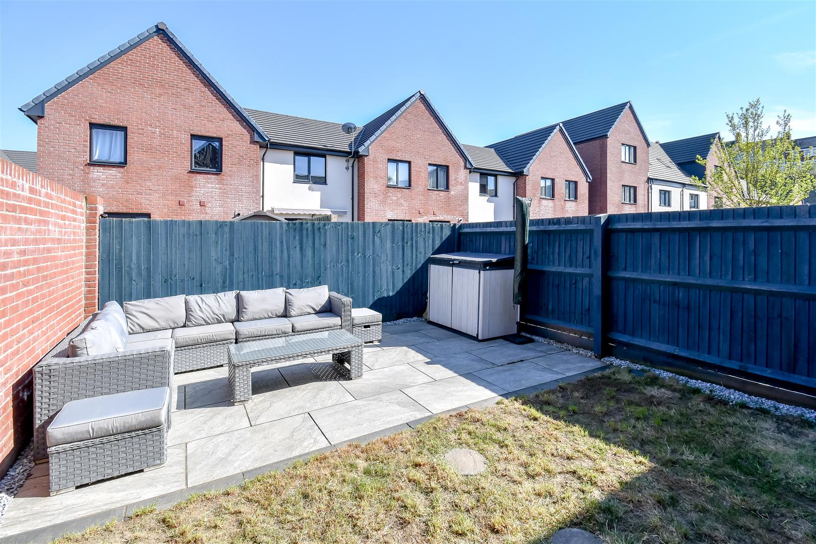 Enclosed rear garden, Porcelain tiled terrace. Laid to lawn. Feather edged fencing surrounding. Side access to front drive.