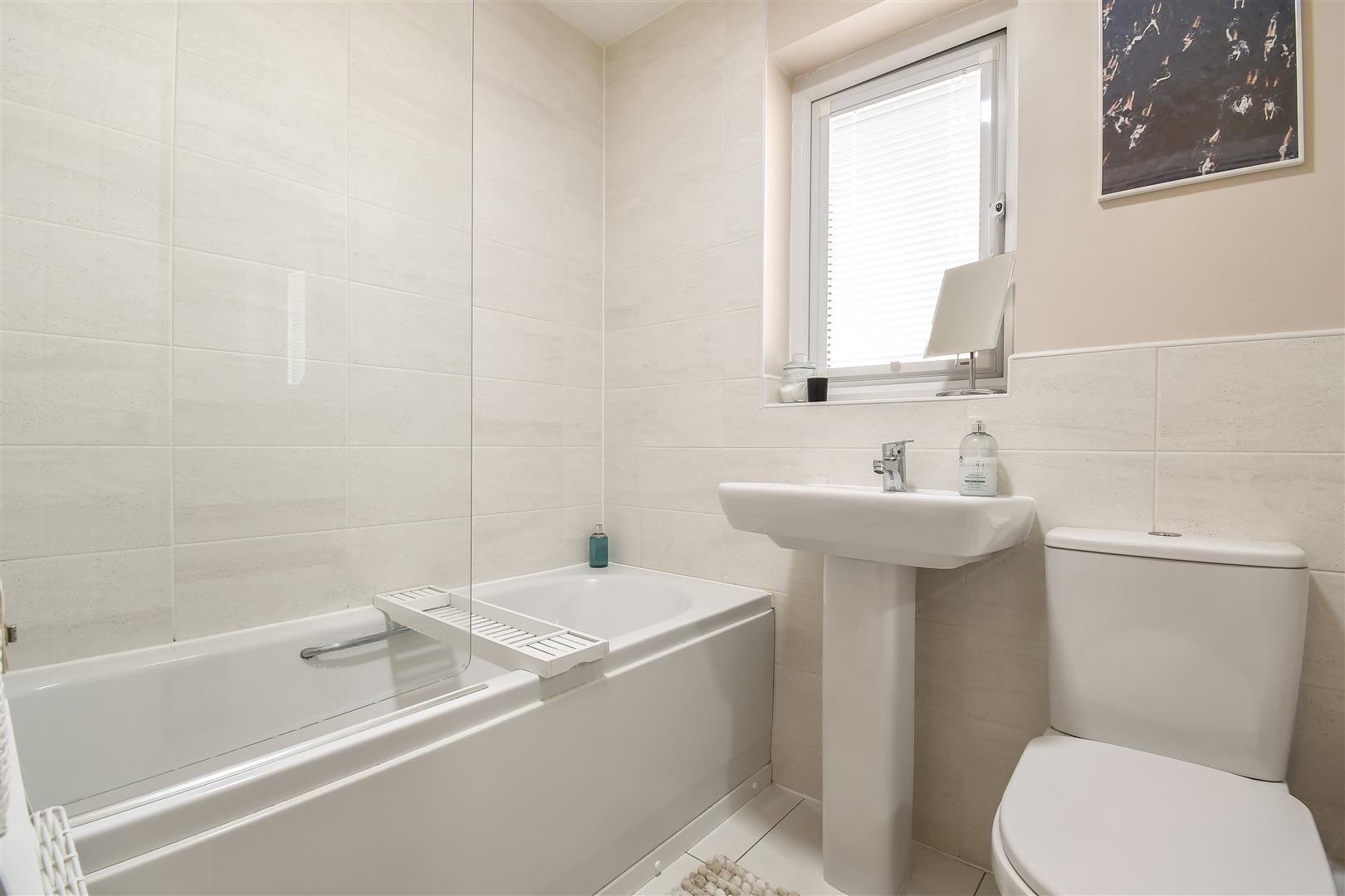 Smoothly plastered ceiling with vent extractor, smoothly plastered walls. Ceramic tiled splashbacks. Ceramic tiled flooring. Wall mounted radiator. UPVC double glazed window with obscured glass to the front elevation. Pedestal wash hand basin. Bath with thermostatically controlled shower overhead. Close coupled toilet. Wood framed door leading to the first floor landing.