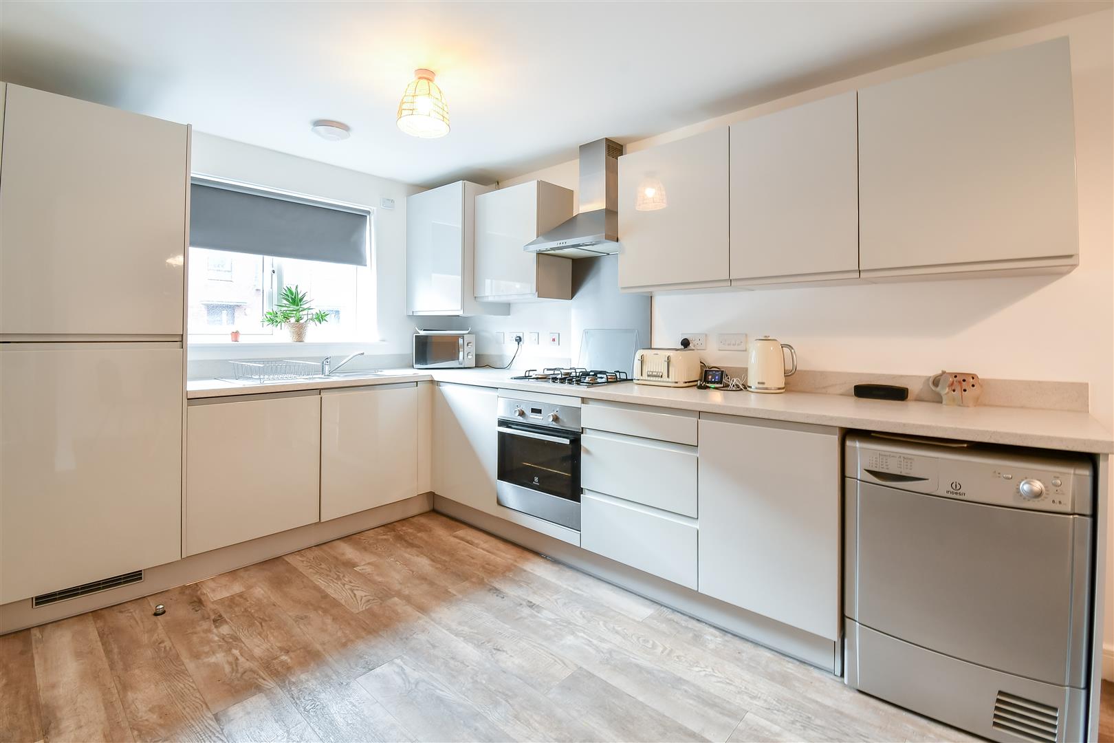 Smoothly plastered ceiling with vent extractor, smoothly plastered walls. Karndean flooring. Wall mounted radiator. UPVC double glazed window to the front elevation. A modern fitted kitchen, comprising of wall and base units. Wood laminate worktops. Integrated fridge / freezer. Integrated four ring gas hob. Integrated oven. Integrated washing machine. Integrated dishwasher. Stainless steel sink, space for tumble dryer. Wood panelled door leading through to the entrance hallway. Wall mounted concealed combination boiler. A further wood panelled door leading to W.C. Cloakroom. Wood panelled door leading through to living room.