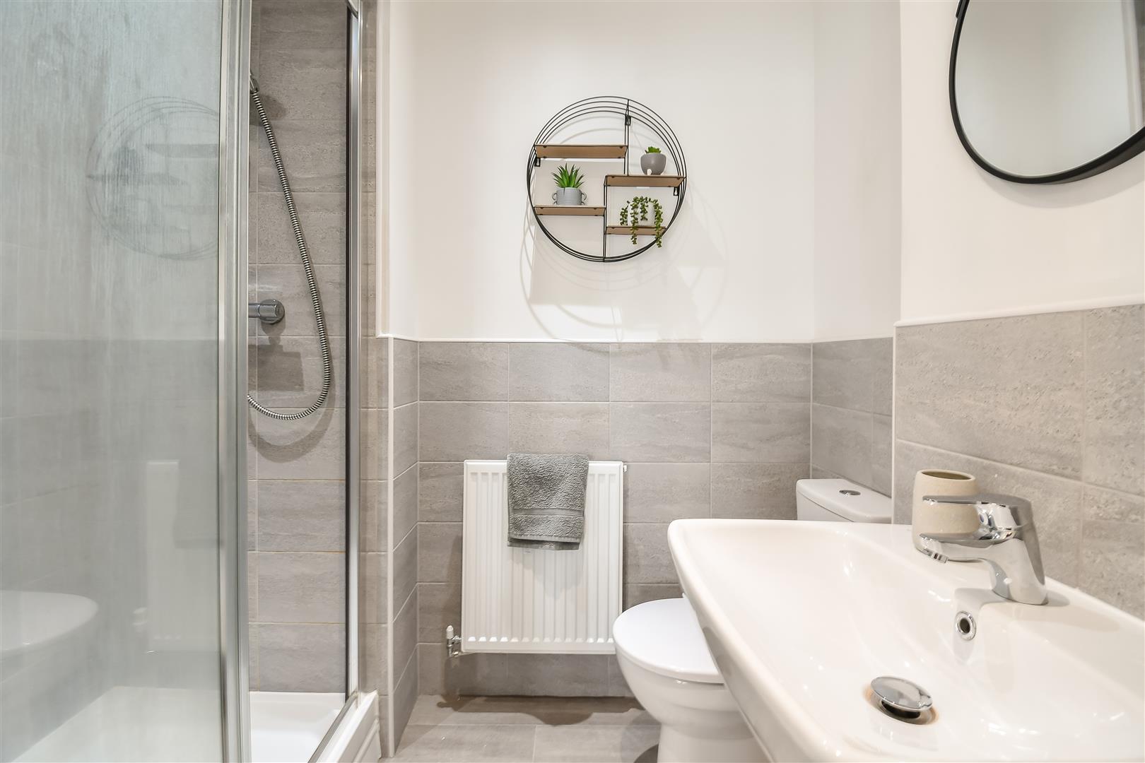 Smoothly plastered ceiling with inset lights and vent extractor, smoothly plastered walls. Vinyl flooring. Wall mounted radiator. Ceramic tiled splashback's. Pedestal wash hand basin. Close coupled toilet. Double shower with thermostatically controlled shower overhead. Wood panelled door leading to bedroom one.