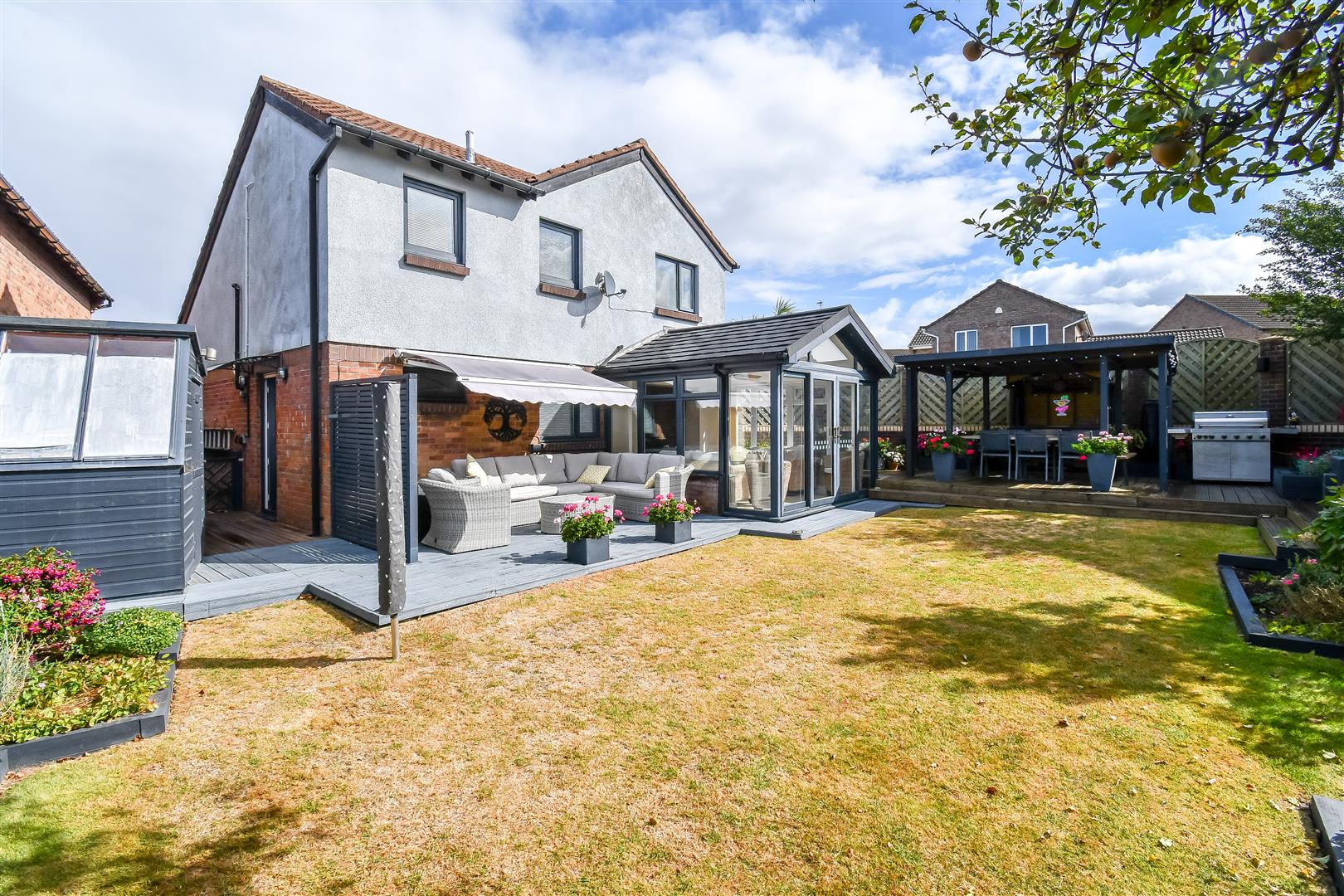 Outside, the enclosed private garden is a true highlight, featuring established shrubbery and a well-maintained lawn. A raised covered seating area offers a perfect spot for outdoor gatherings or simply enjoying the peaceful surroundings. Further area for garden furniture on a lower decked area. Side area with sheds to remain and access to the front of the property adds to the convenience.