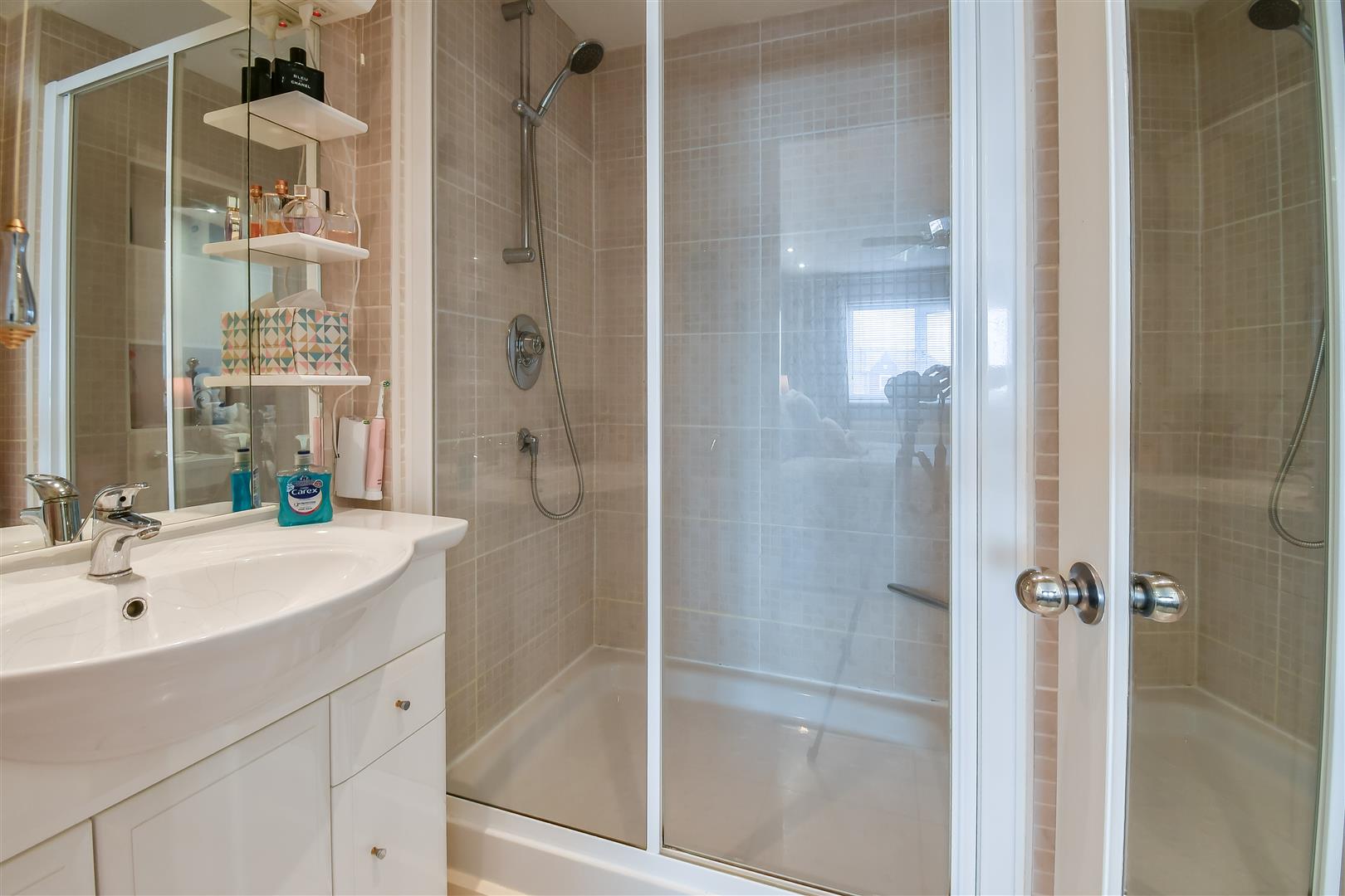Textured ceiling with inset lights, ceramic tiled walls with vent extractor. Wood laminate flooring. Double shower with thermostatically controlled shower overhead. Vanity wash hand basin. Wood panelled door leading through to the master bedroom.