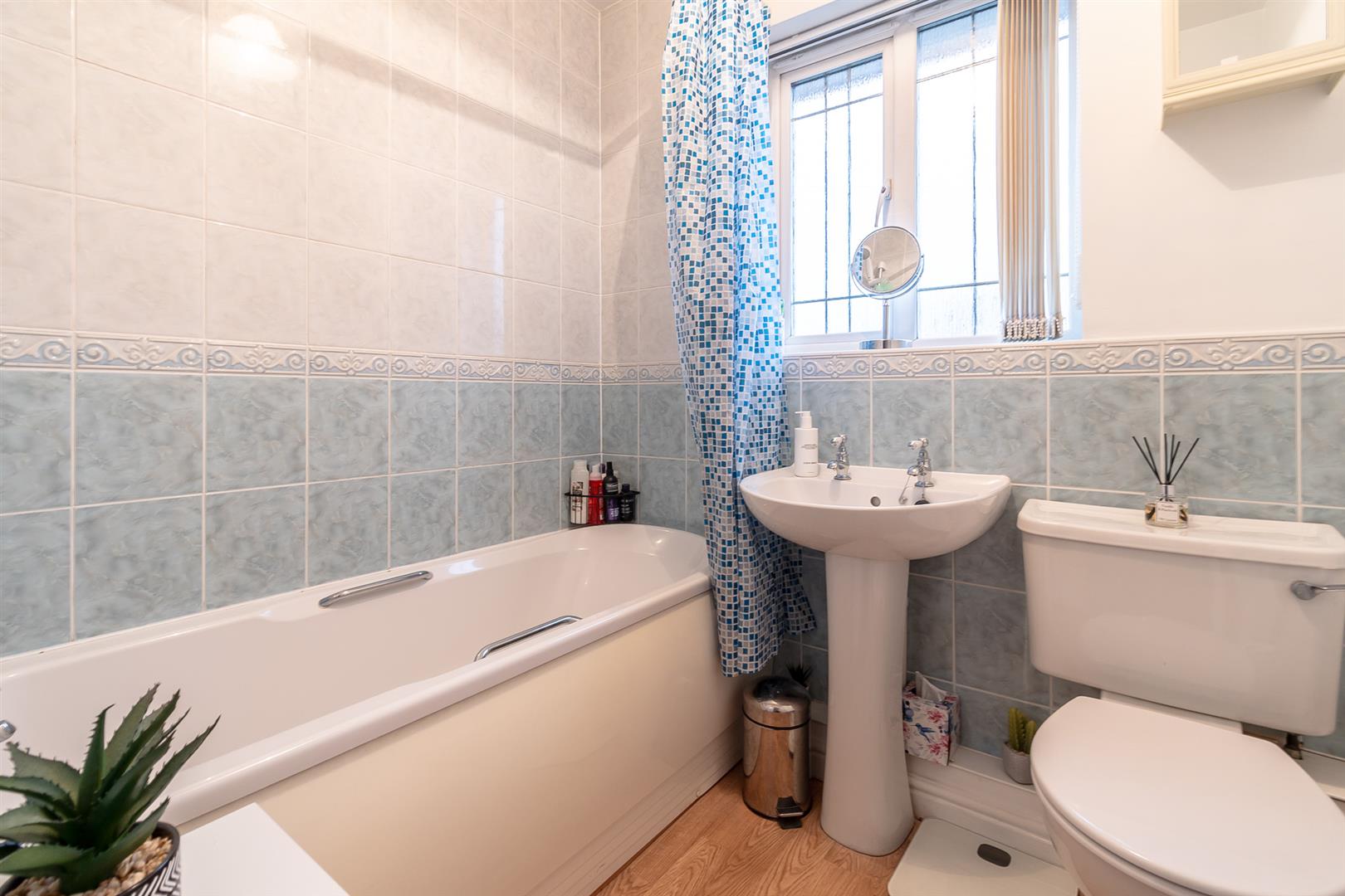 Smoothly plastered ceiling with vent extractor. Smoothly plastered walls - part porcelain tiled. Vinyl flooring. Wall mounted radiator. UPVC double glazed window with obscured glass to the front. Pedestal wash hand basin, bath with electric shower overhead. Close coupled toilet. Wood panelled door leading through to the first floor landing.