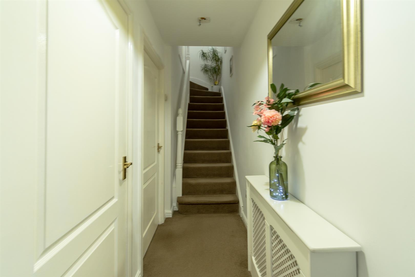 Smoothly plastered ceiling, smoothly plastered walls. Fitted carpet flooring. Wall mounted radiator. UPVC double glazed front door with obscured glass insert to the front. Wood panelled door leading to W.C Cloakroom and living room. Fitted carpet carpet leading to the first floor.
