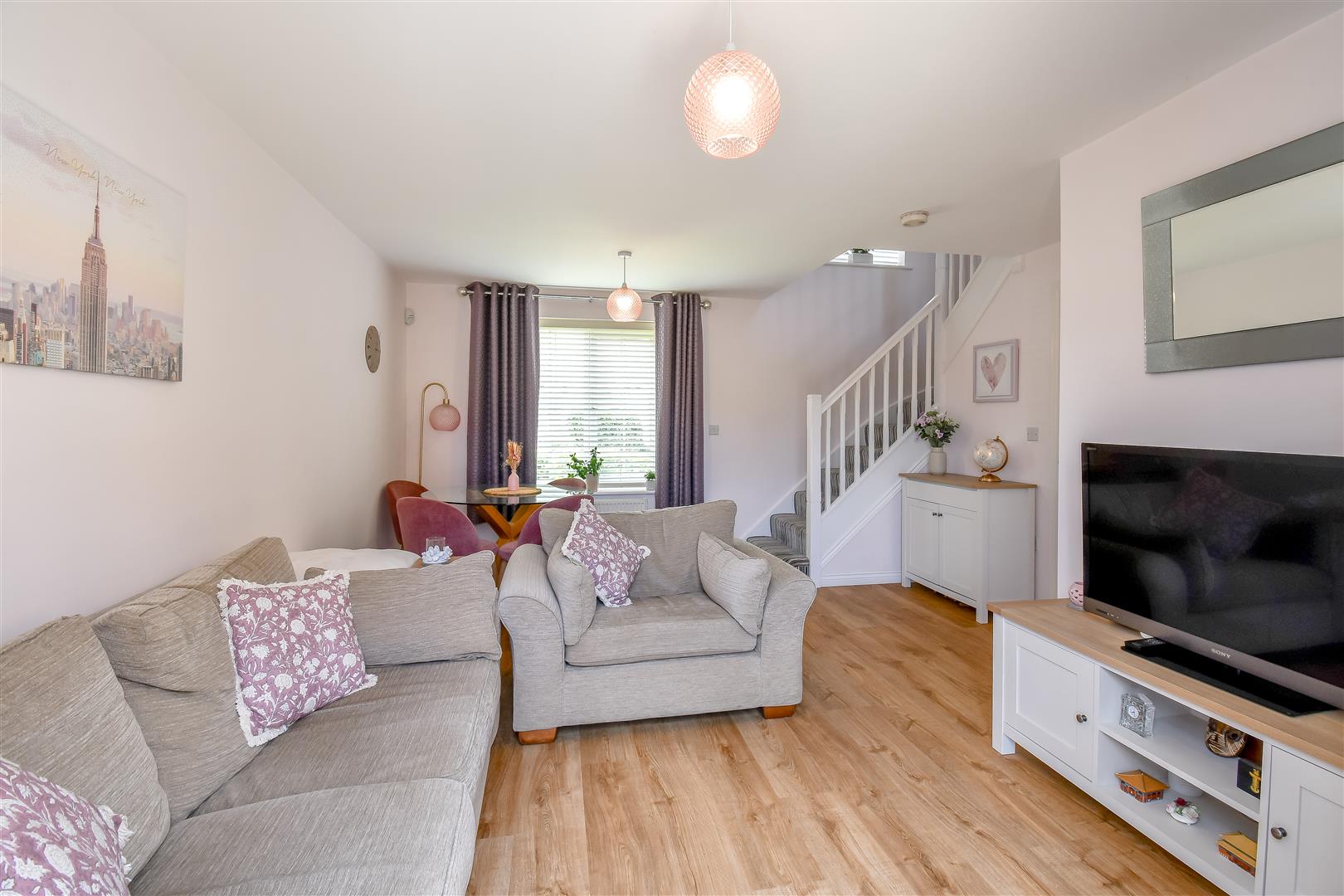 Smoothly plastered ceiling. Smoothly plastered walls. LVT wood effect flooring. UPVC double glazed window to the front. UPVC double glazed French doors opening to the rear garden. Radiator. Fitted carpet stairs rising to the first floor.