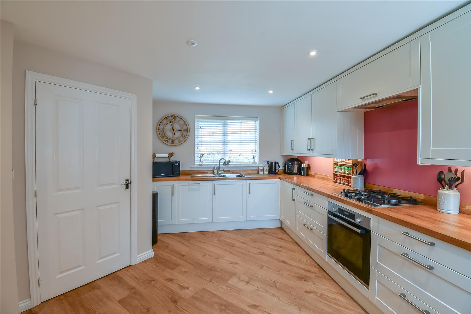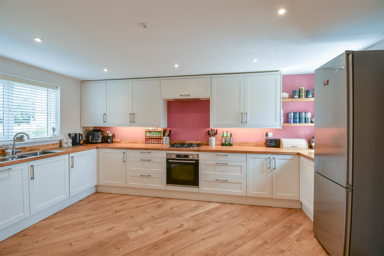 Smoothly plastered ceiling with inset spotlights. Smoothly plastered walls. LVT wood effect flooring. UPVC double glazed windows to the front and rear. Radiator. Door to storage cupboard, cloakroom/WC and living room. Fitted kitchen comprising of eye level and base units. Solid oak work surfaces with complementary uprisers. Integrated Bosch electric oven and four ring gas hob, extractor fan inset above. Integrated dish washer and washing machine. Space for fridge freezer. Wall mounted combination boiler.