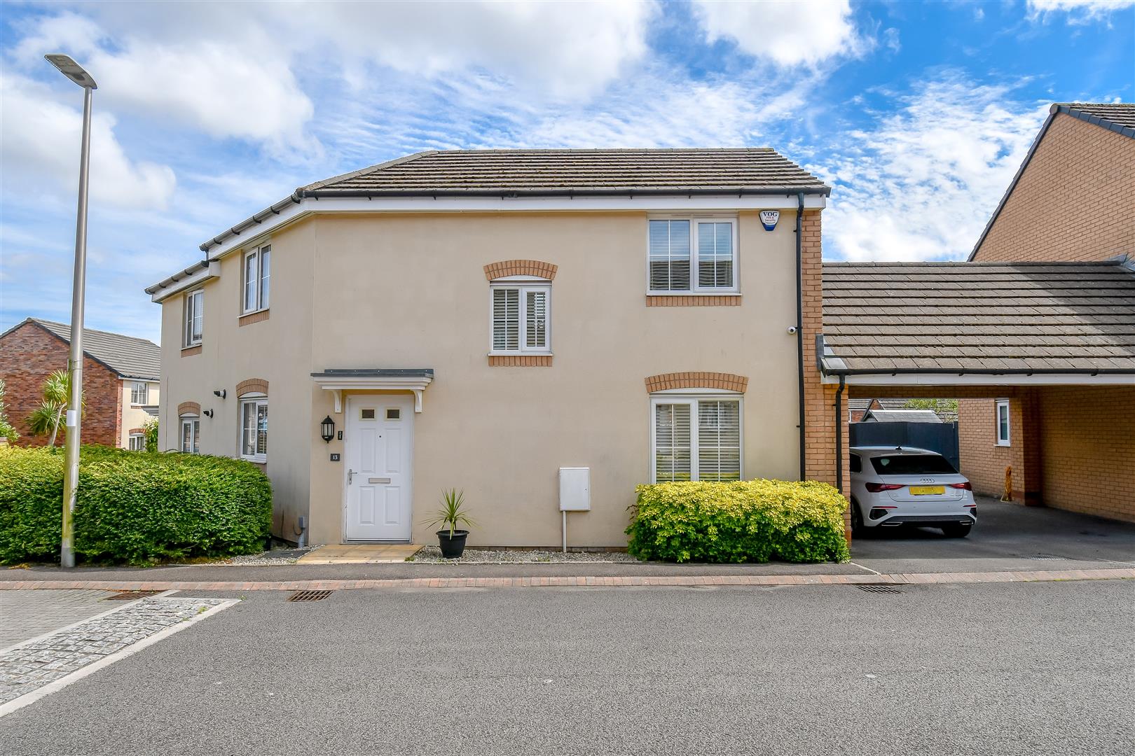 Open plan front garden with shrubbery. Stone chippings. Pathway leading to a composite front door. Parking to the side for two vehicles. Side access leading to the rear garden.