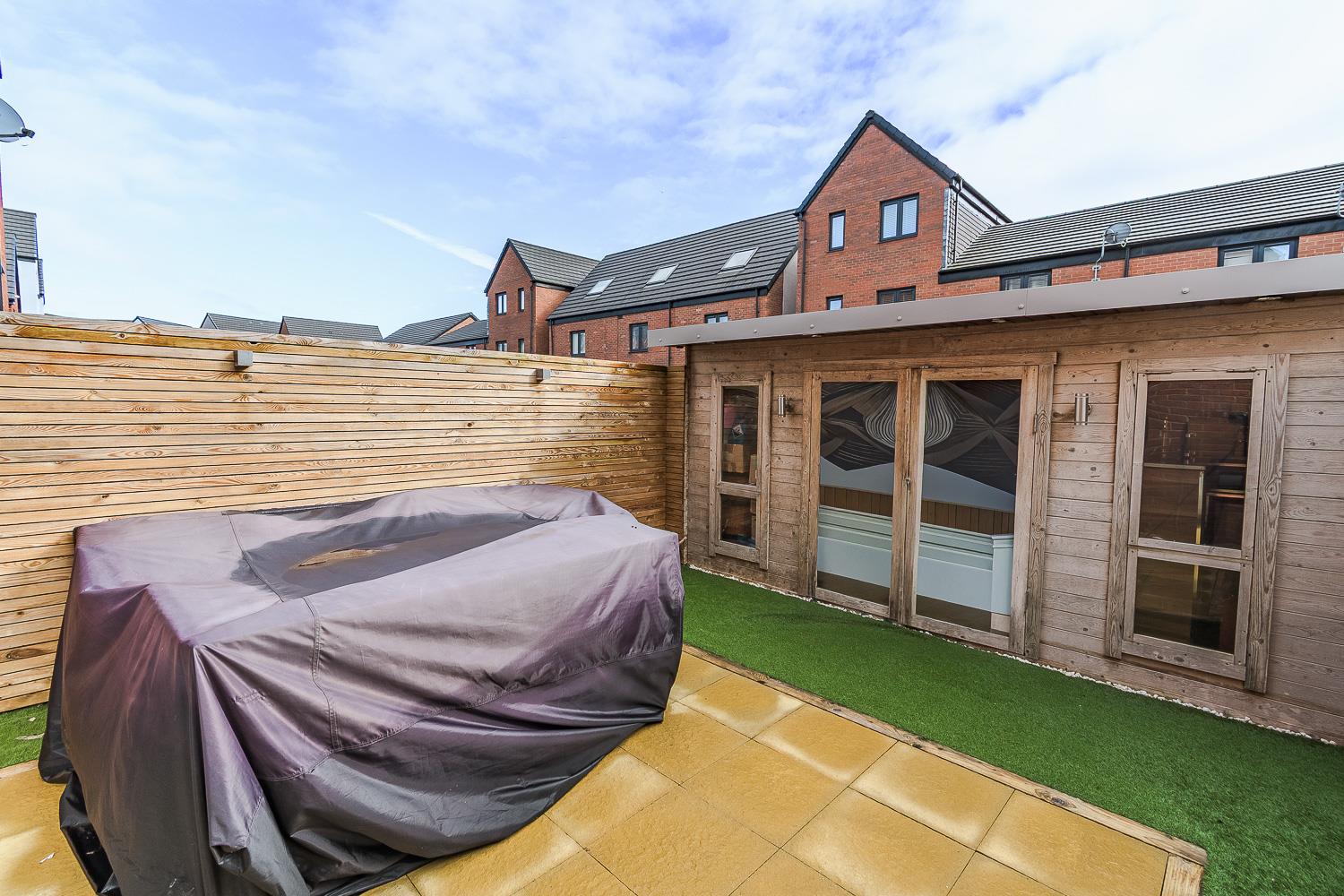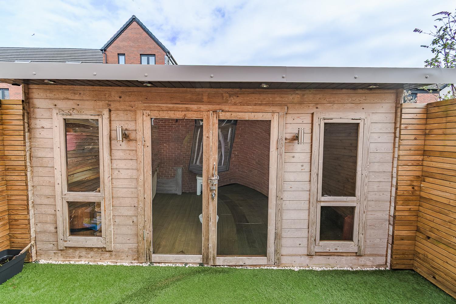 The rear garden is a true highlight, featuring a paved patio area and an Astro-turfed lawn, ideal for hosting gatherings. A charming garden lodge, equipped with power and lighting, offers a versatile space for entertaining or a quiet home office.