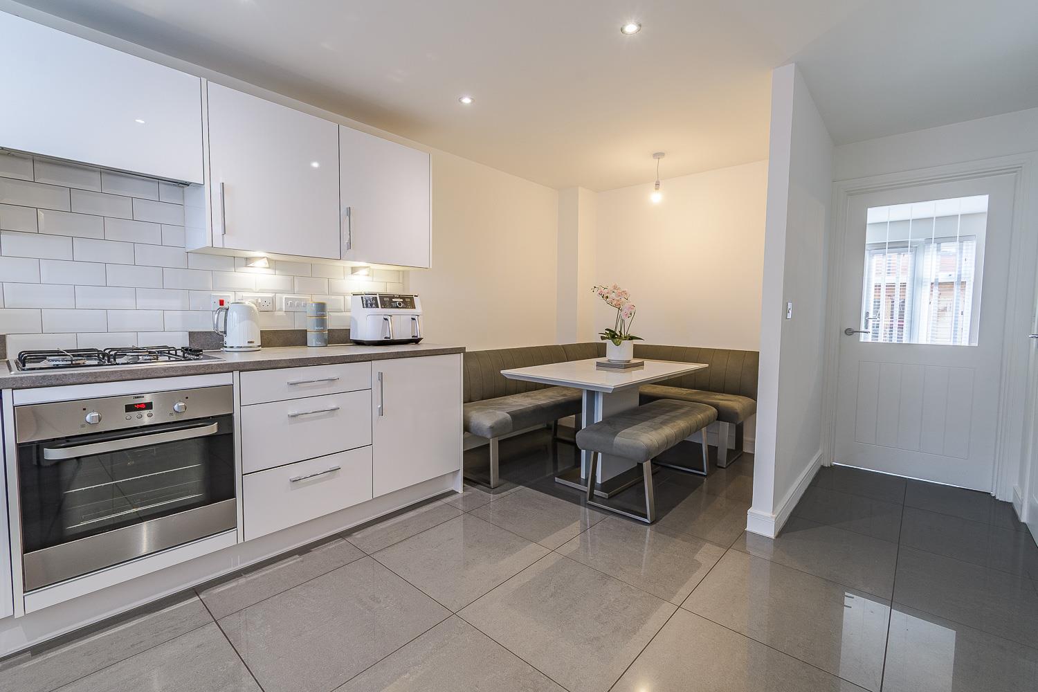 Smoothly plastered ceiling with inset lights and vent extractor, smoothly plastered walls. Porcelain tiled flooring. Wall mounted radiator. UPVC double glazed window to the front elevation. Modern fitted kitchen comprising of wall and base units. Wood laminate worktops and upstands. Porcelain tiled splashbacks. Integrated washer dryer, integrated fridge / freezer, integrated dishwasher. Four ring gas hob, integrated oven. Integrated cooker hood. Wall mounted combination boiler housed. Space for dining furniture. Wood panelled door leading to a W.C. cloakroom. Wood framed door leading through to the living room. A further wood frame door leading through to the entrance hallway.