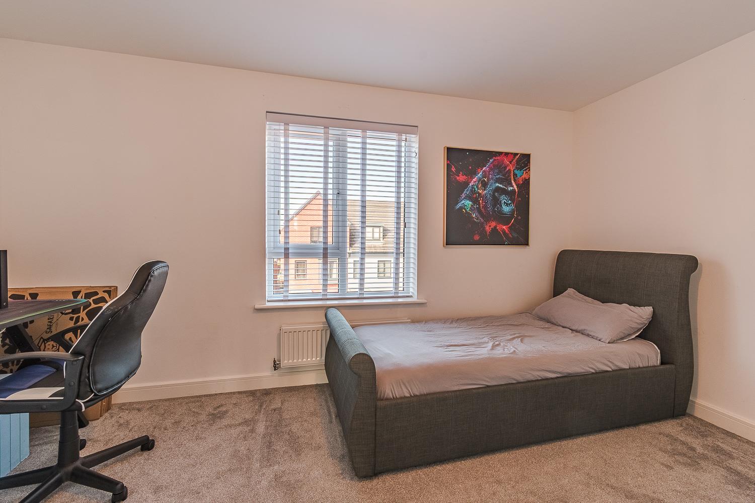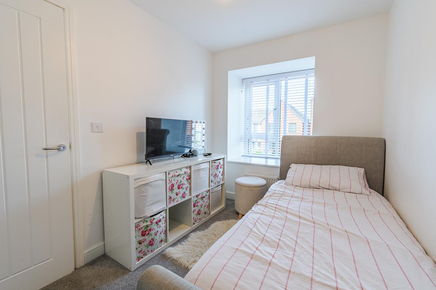 Smoothly plastered ceiling, smoothly plastered walls. Fitted carpet flooring. Wall mounted radiator. UPVC double glazed window to the front elevation. Access to built-in storage. Wood panelled door leading through to the second floor landing.