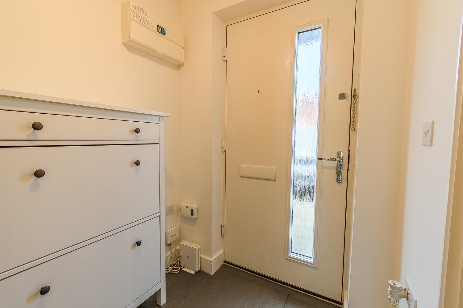 Smoothly plastered ceiling, smoothly plastered walls. Porcelain tiled flooring. Composite front door with obscured glass insert. Fitted carpet staircase rising to the first floor. Wood framed door with glazed insert leading through to kitchen / Dining room.