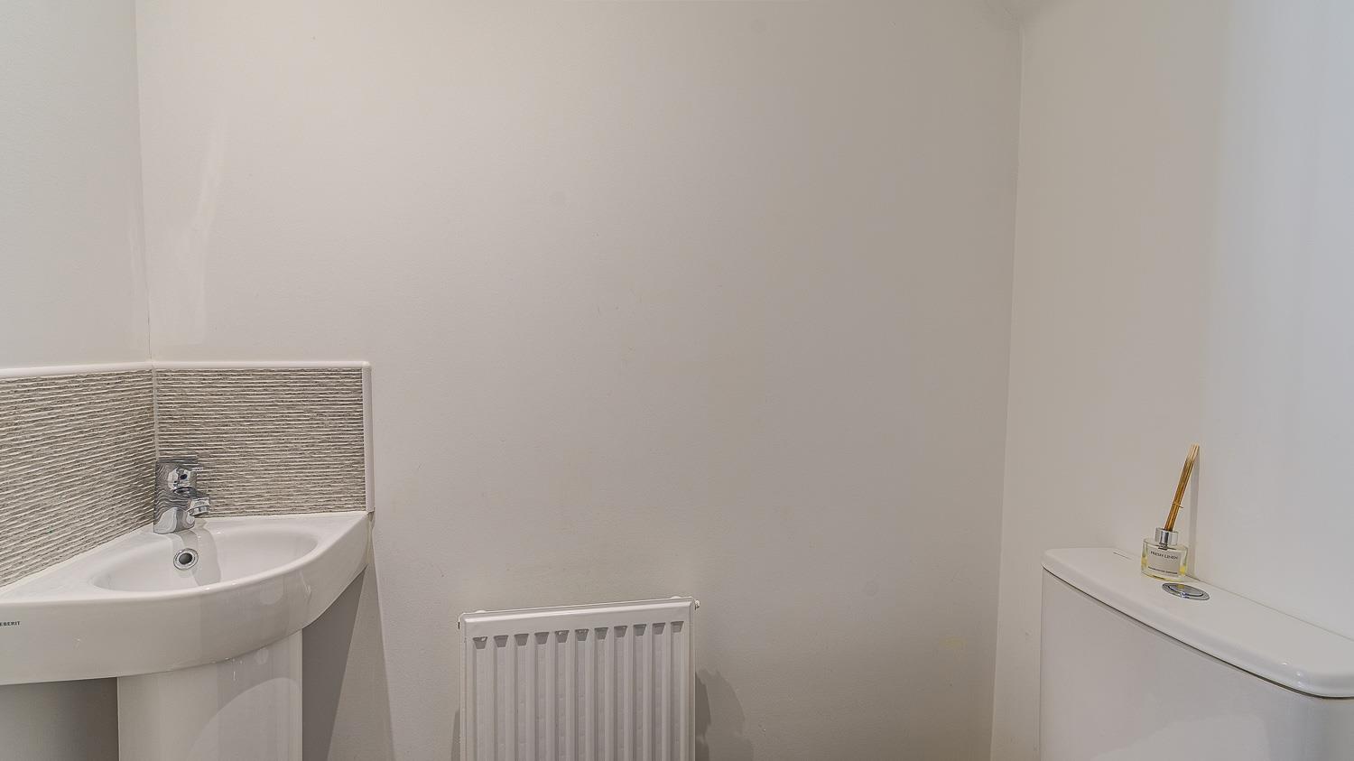 Smoothly plastered ceiling with inset lights and vent extractor, smoothly plastered walls. Porcelain tiled flooring. Ceramic tiled splashbacks. Wall mounted radiator. Pedestal wash hand basin. Close coupled toilet.