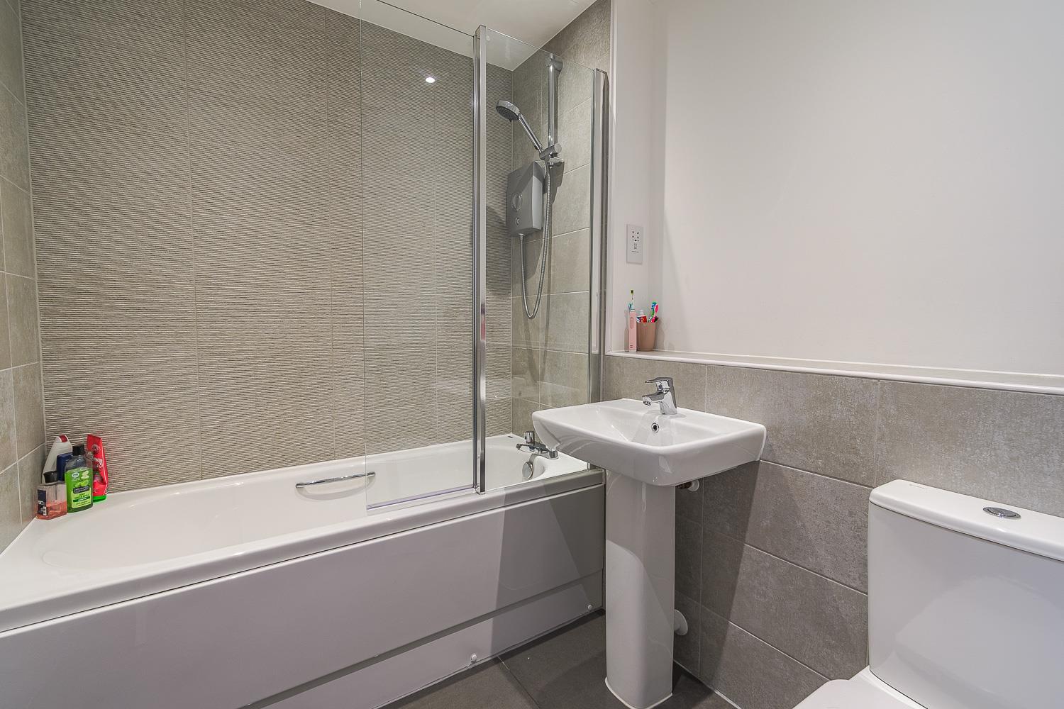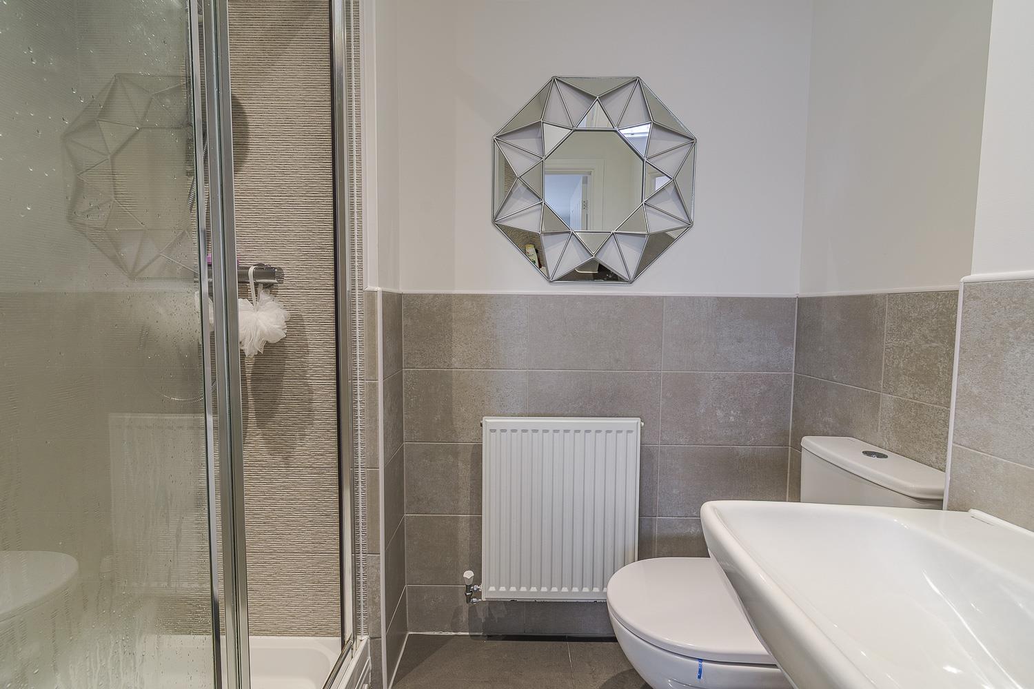 Smoothly plastered ceiling with inset lights and vent extractor. Smoothly plastered walls. Ceramic tiled splashback's. Porcelain tiled flooring. Wall mounted radiator. Pedestal wash hand basin. Close coupled toilet. Double shower with thermostatically controlled shower overhead.