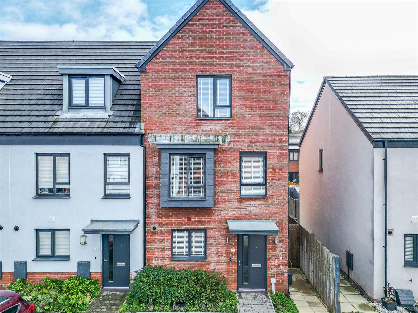 Two allocated parking spaces. Paved pathway. Planted established shrubbery. Composite front door to entrance hallway. Side access to rear.