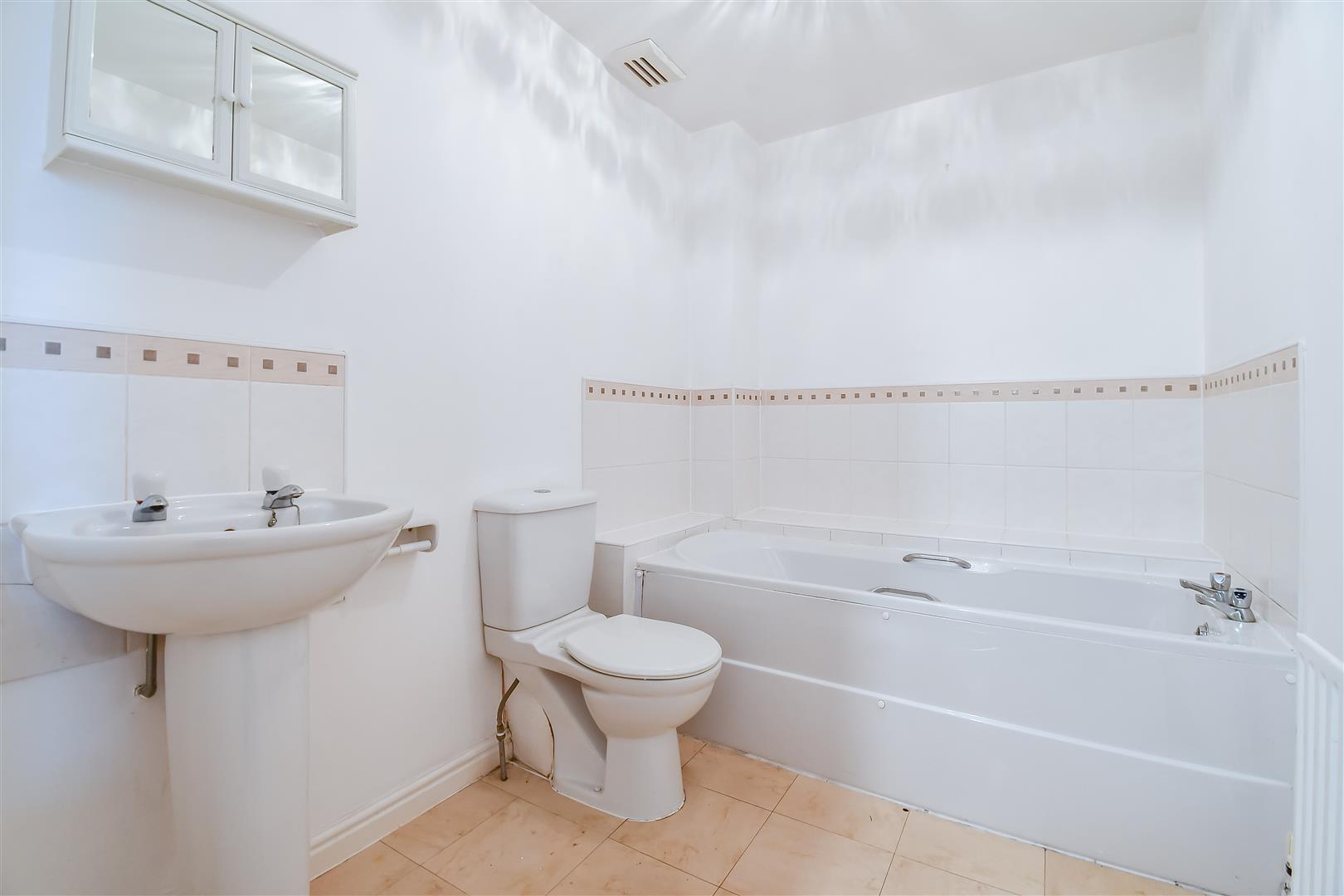 Smoothly plastered ceiling with vent extractor, smoothly plastered walls. Vinyl flooring. Wall mounted radiator. Bath with porcelain tiled splashback's. Pedestal wash hand basin. Close coupled toilet. Wood panelled door leading through to the first floor landing.