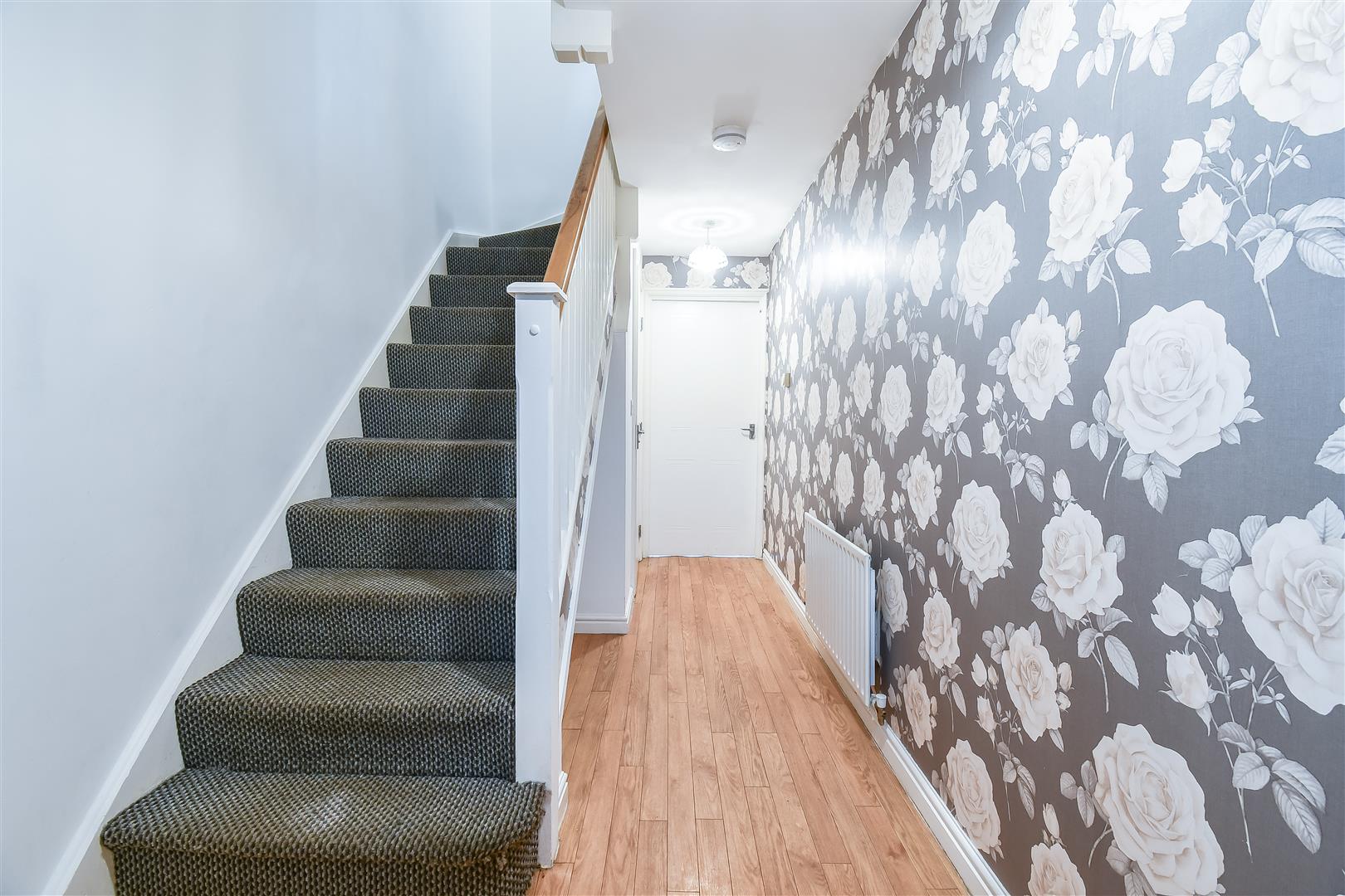 Smoothly plastered ceiling, smoothly plastered walls - part papered. Wood laminate flooring. Wall mounted radiator. Fitted carpet staircase rising to the first floor. Wood panelled door leading through to the kitchen / breakfast. A further wood panelled door leading through to the downstairs W.C. cloakroom.