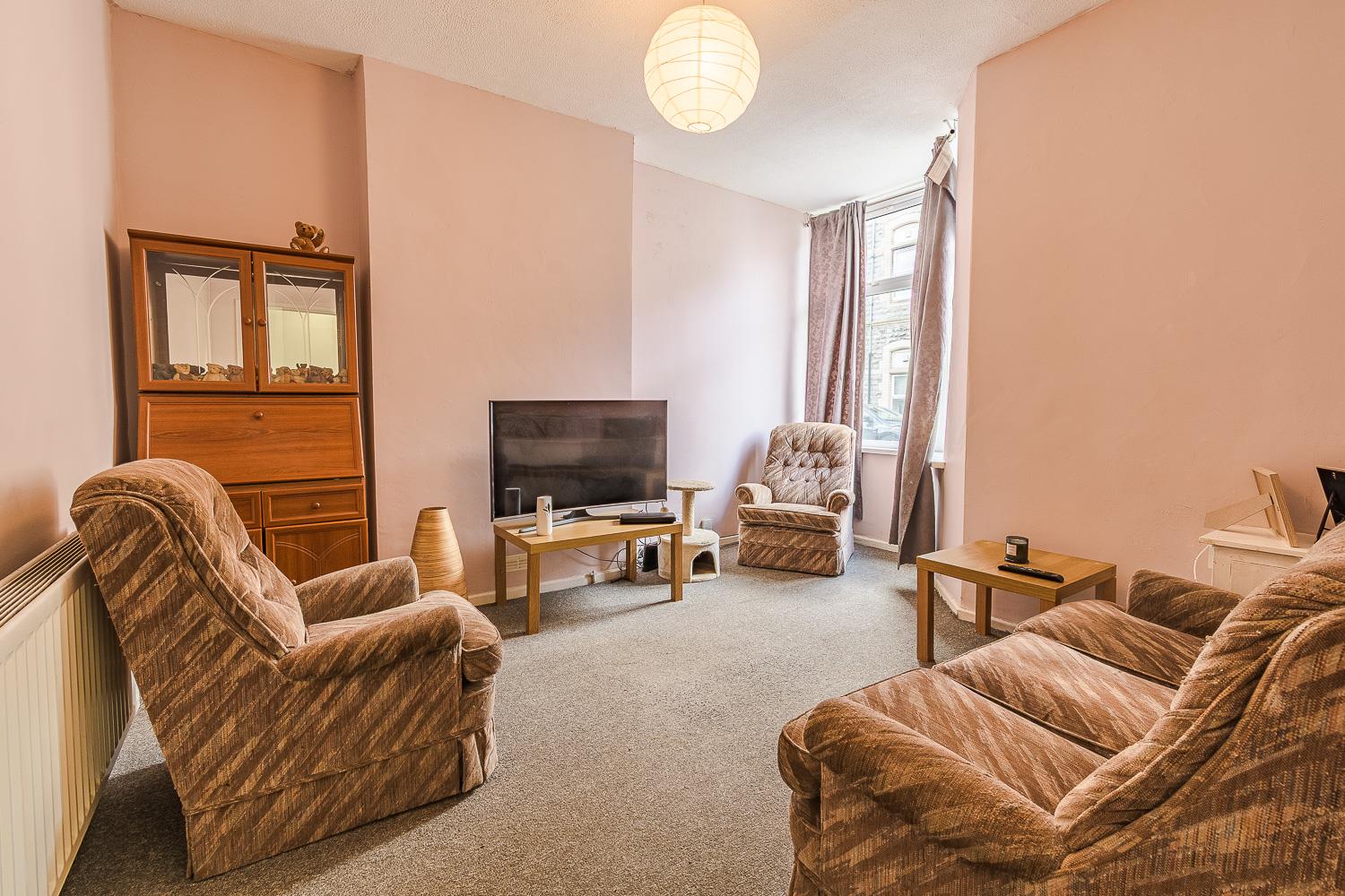 Textured ceiling, smoothly plastered walls. Fitted carpet flooring. Wall mounted radiator. UPVC double glazed bay front window to the front elevation. Through opening to the entrance hallway.