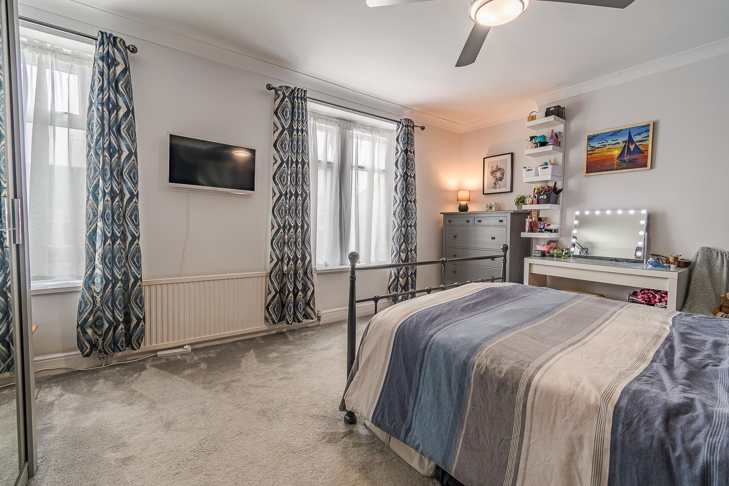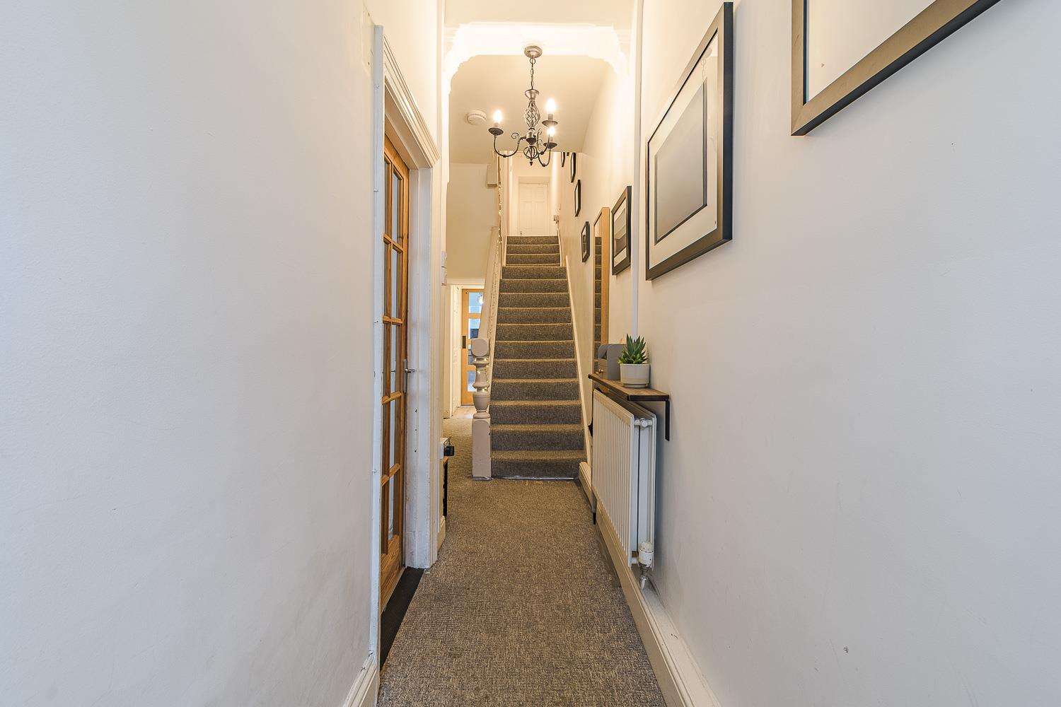 Smoothly plastered ceiling with original coving, smoothly plastered walls. Wood laminate flooring. Wall mounted radiator. UPVC double glazed bay front window. Feature fireplace with slate hearth. Wood framed door with glass insert leading through to the entrance hallway.