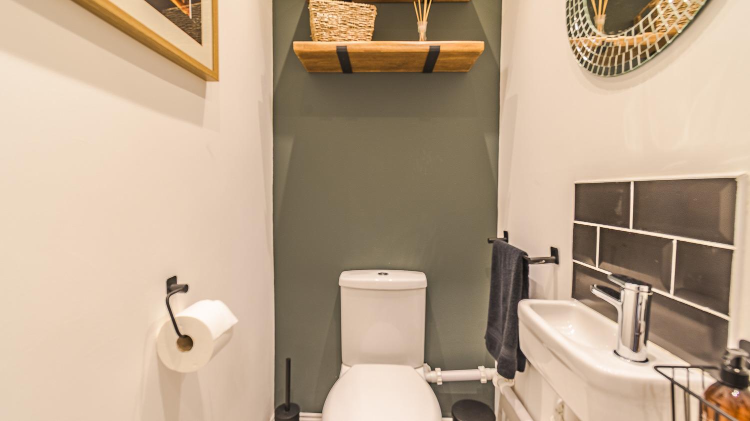 Smoothly plastered ceiling with inset lights and vent extractor, smoothly plastered walls. Vinyl flooring. Wall mounted wash hand basin. Ceramic tiled splashback. Close coupled toilet. Bi- folding wooden doors leading through to the entrance hallway.