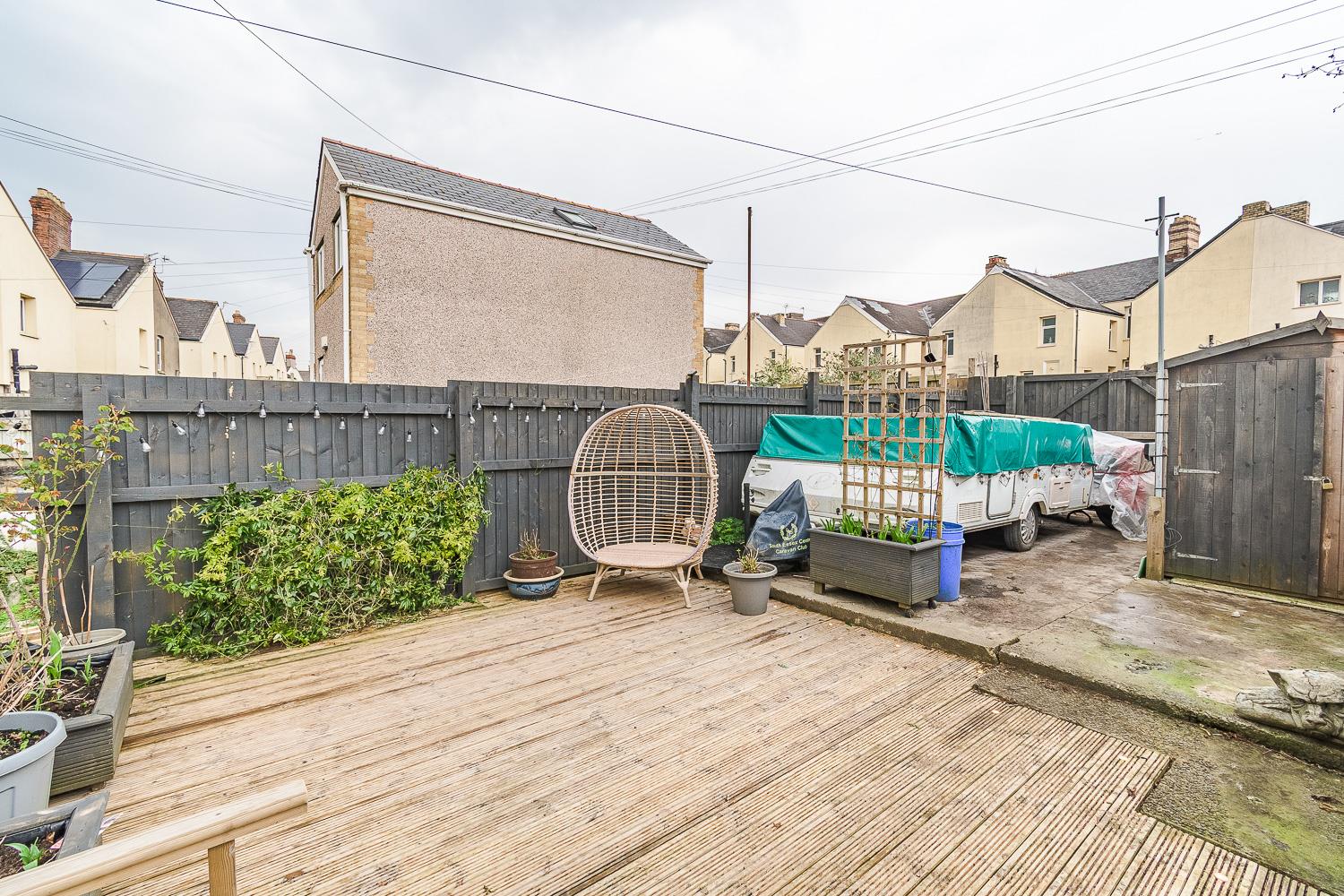 Enclosed rear garden. Patio area to the lower area providing ample room for furniture. Decked steps with integrated lighting leads to an elevated decked terrace with continuation of integrated lighting surrounding, parking accessed via the rear lane with double gate entry. Planted established shrubbery. Space for shed. Power and Lighting to lower and upper areas.