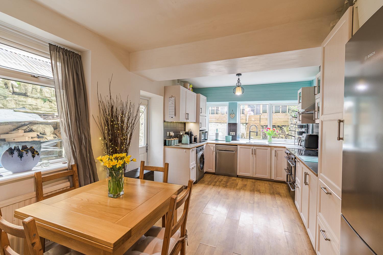 Smoothly plastered ceiling, smoothly plastered walls. Wood laminate flooring. Wall mounted radiator. UPVC double glazed windows to the side and rear elevations. UPVC double glazed door leading out to the rear garden. Fitted kitchen, comprising of wall and base units. Wood laminate worktops. Porcelain Belfast sink and drainer. Space for range cooker. Stainless steel cooker hood. Space for washing machine, space for dishwasher, and space for fridge / freezer. Wood framed sliding glazed door leading through to the entrance hallway.