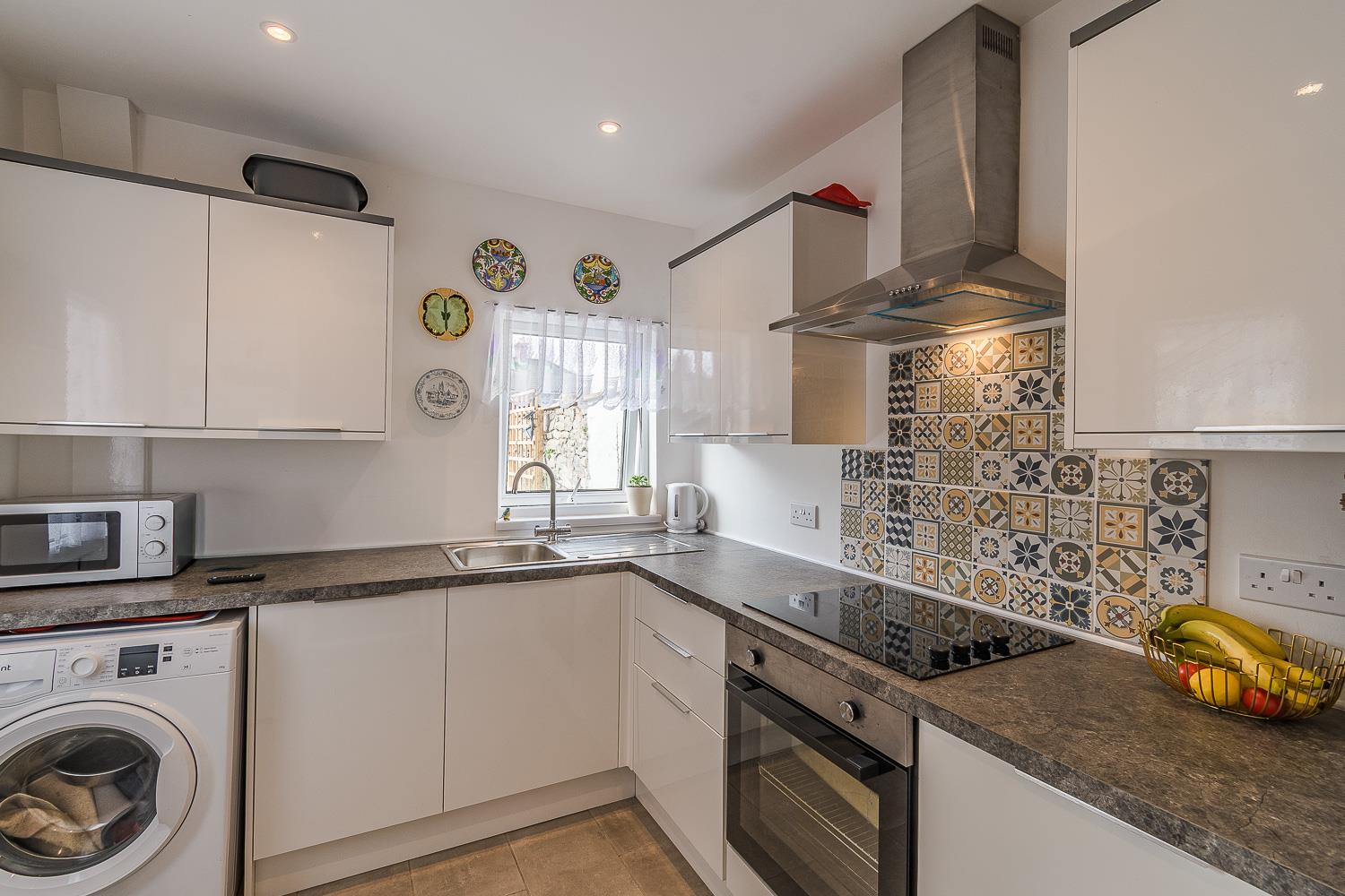 Smoothly plastered ceiling with coving and inset lighting, smoothly plastered walls. Ceramic tiled flooring. UPVC double glazed window to the rear, UPVC double glazed door leading to the rear garden. Modern fitted kitchen comprising of wall and base units. Wood laminate worktops. Stainless steel sink. Integrated Induction hob, integrated oven. Space for washing machine, space for fridge freezer.
