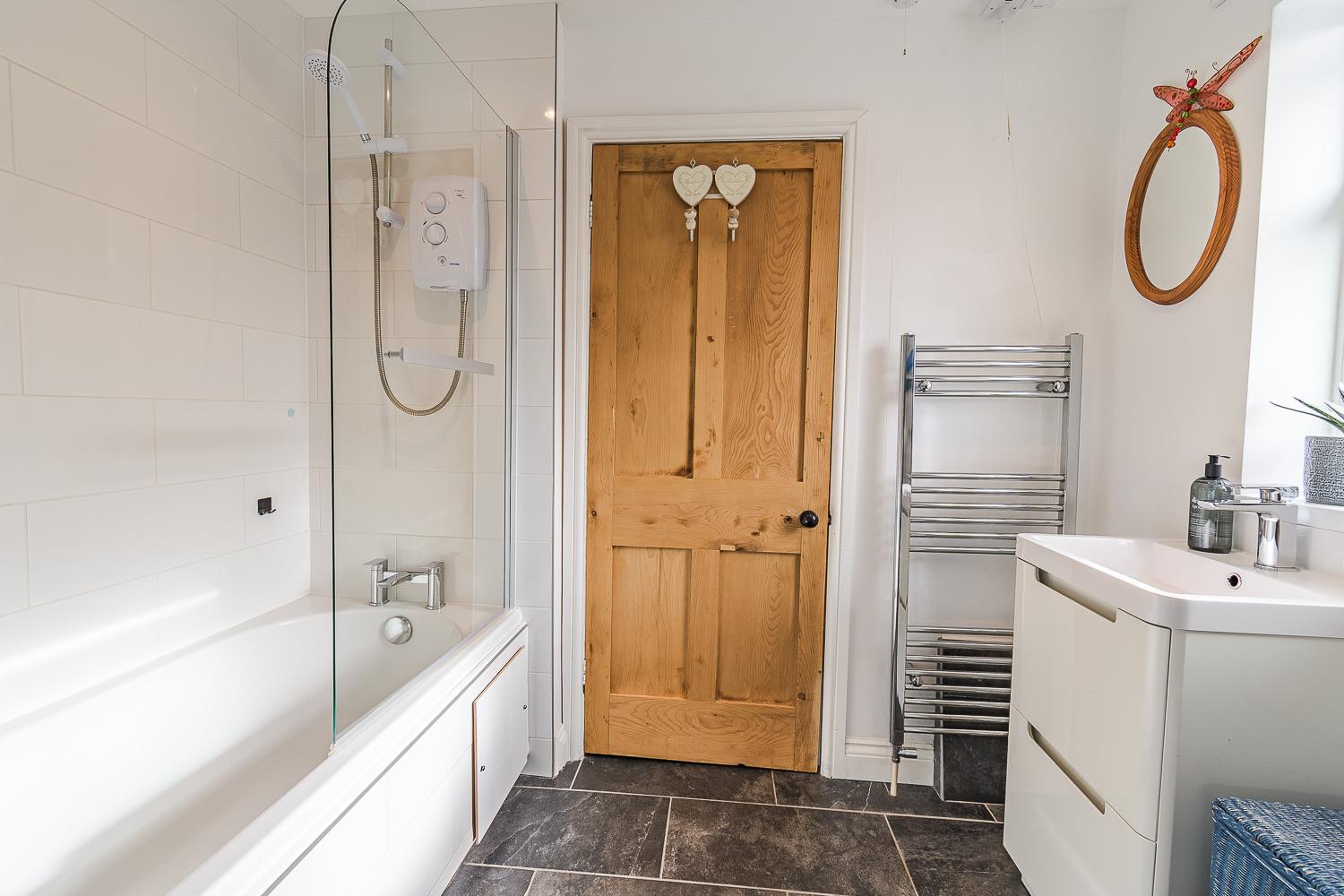 Smoothly plastered ceiling with inset lights, smoothly plastered walls with vent extractor. Ceramic tiled flooring. Wall mounted towel rail. UPVC double glazed windows to the side and rear with obscured glass insert. Bath with electric shower overhead. Vanity wash hand basin. Close coupled toilet. Housed wall mounted combination boiler.