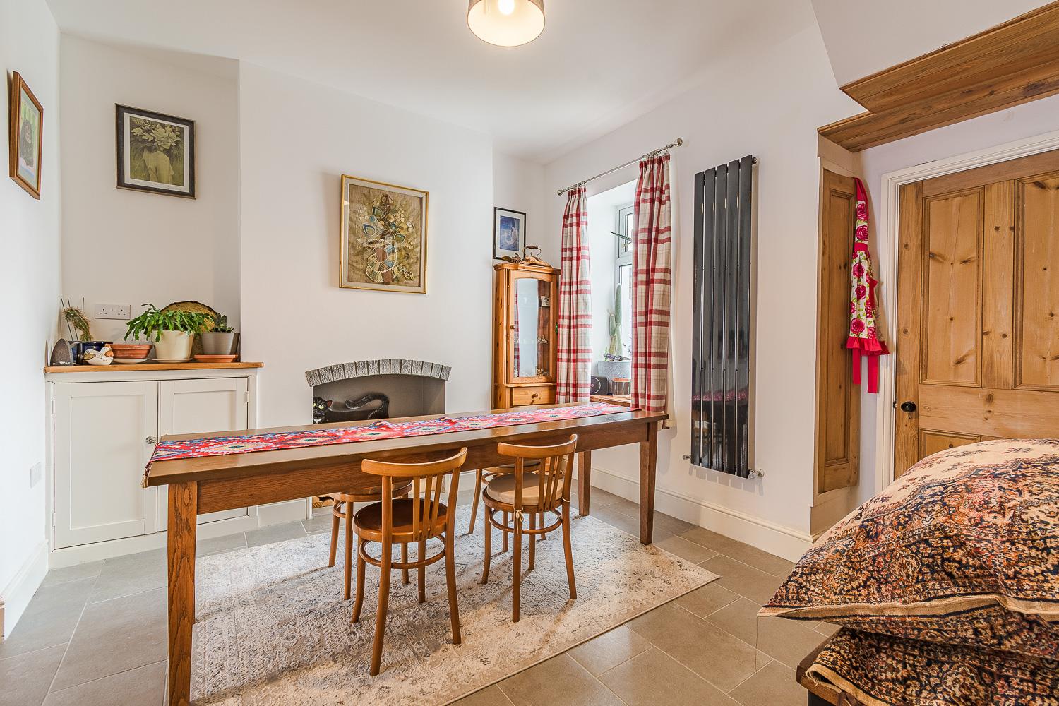 Smoothly plastered ceiling with coving, smoothly plastered walls, original floorboards flooring. Wall mounted radiator. UPVC double glazed window to the front elevation. Revealed brick chimney breast, log burning stove with slate hearth. Through opening to dining room.