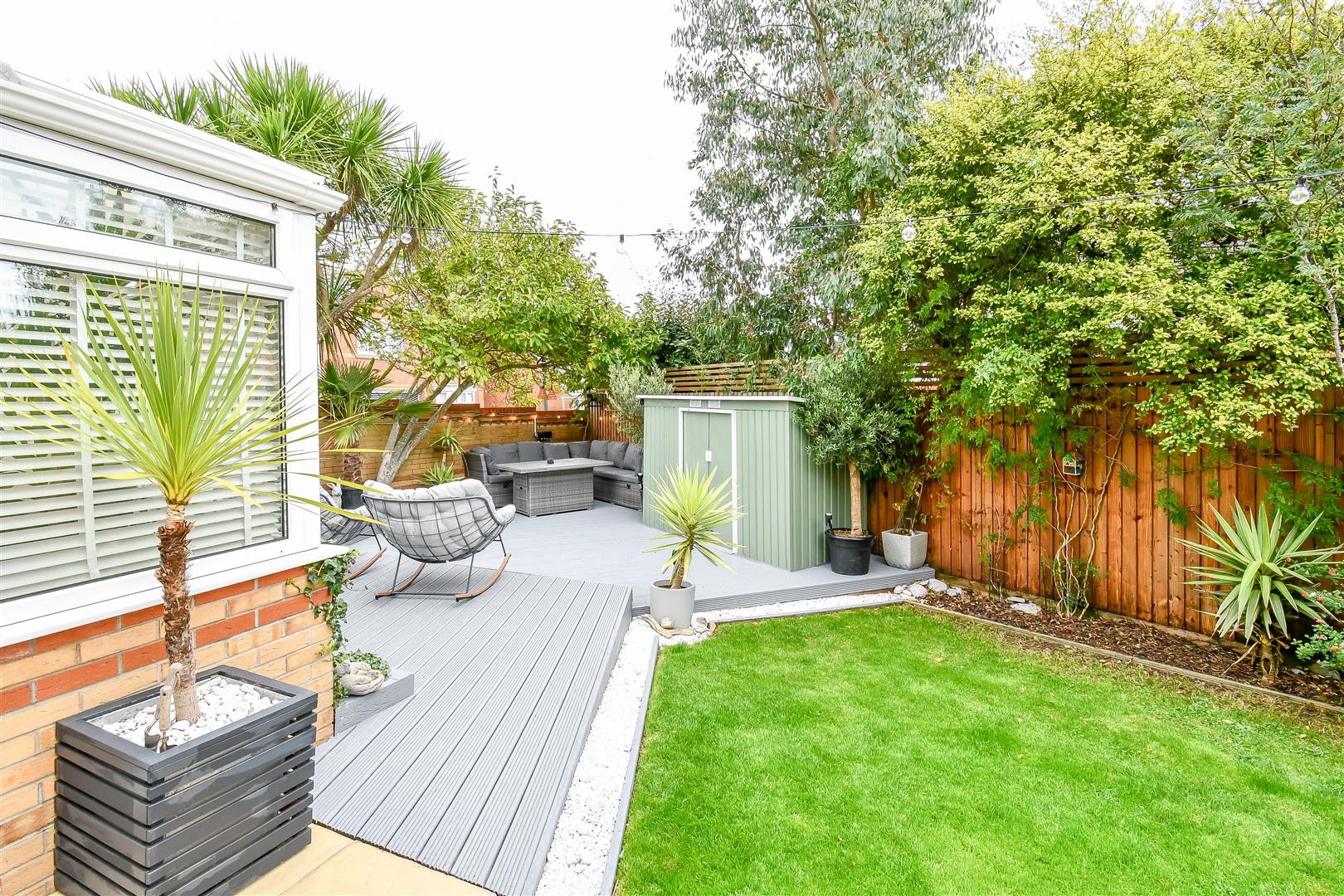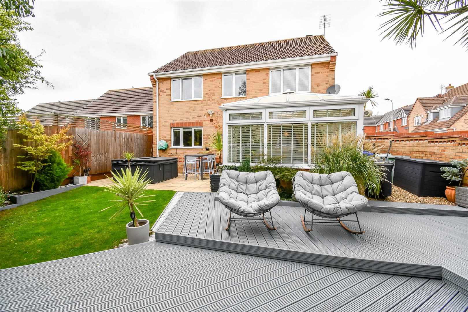 Enclosed landscaped south facing rear garden. Paved patio area leading from conservatory via French doors. Space for hot tub. Laid to lawn with planted shrubbery surrounding. Raised decked area providing ample room for garden furniture and surrounded by further shrubbery. Side area for storage and space for a garden shed.