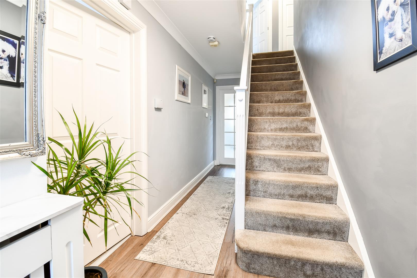 Smoothly plastered ceiling with coving, smoothly plastered walls. Wood laminate flooring. Wall mounted radiator. Fitted carpet staircase rising to the first floor. Wood panelled doors leading to living room, a further wood panelled door leading to kitchen / dining area. W.C. Cloakroom. Composite front door with obscured glass insert and side window.