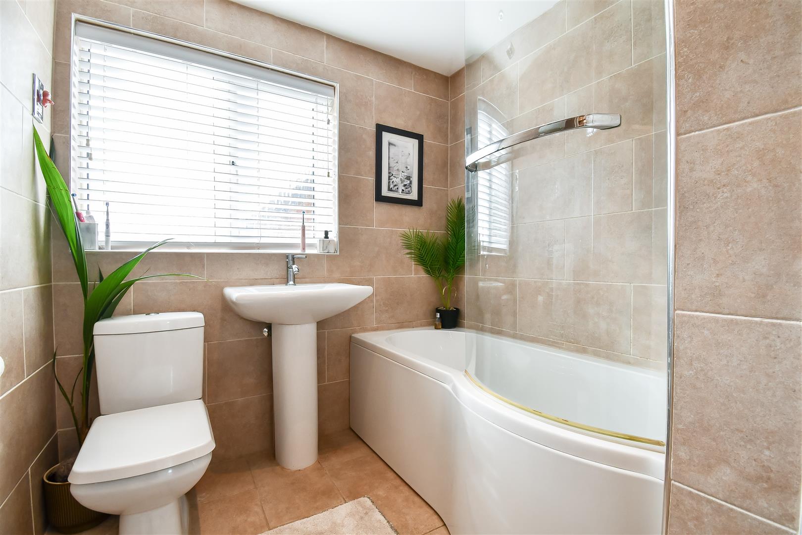 Smoothly plastered ceiling with event extractor, smoothly plastered walls. Ceramic tiled flooring. Wall mounted radiator. Vanity wash hand basin. Close coupled toilet. Wood panelled door leading through to the entrance hallway.