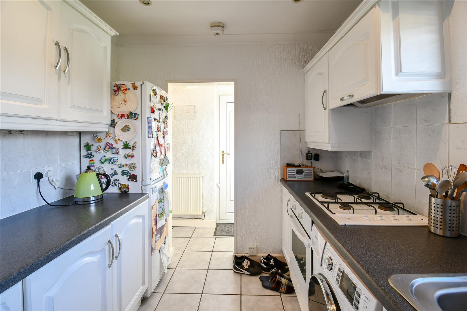 Plastered ceiling with inset spotlights and coving. Papered walls with splash back tiles. Tiled flooring. UPVC double glazed window to the rear. Kitchen comprises of eye level wall units, base units and work surfaces over. Stainless steel sink with drainer board and mixer tap. Fitted electric oven and four ring gas hob. Extractor fan above. Space for fridge/freezer. Plumbing for washing machine.
