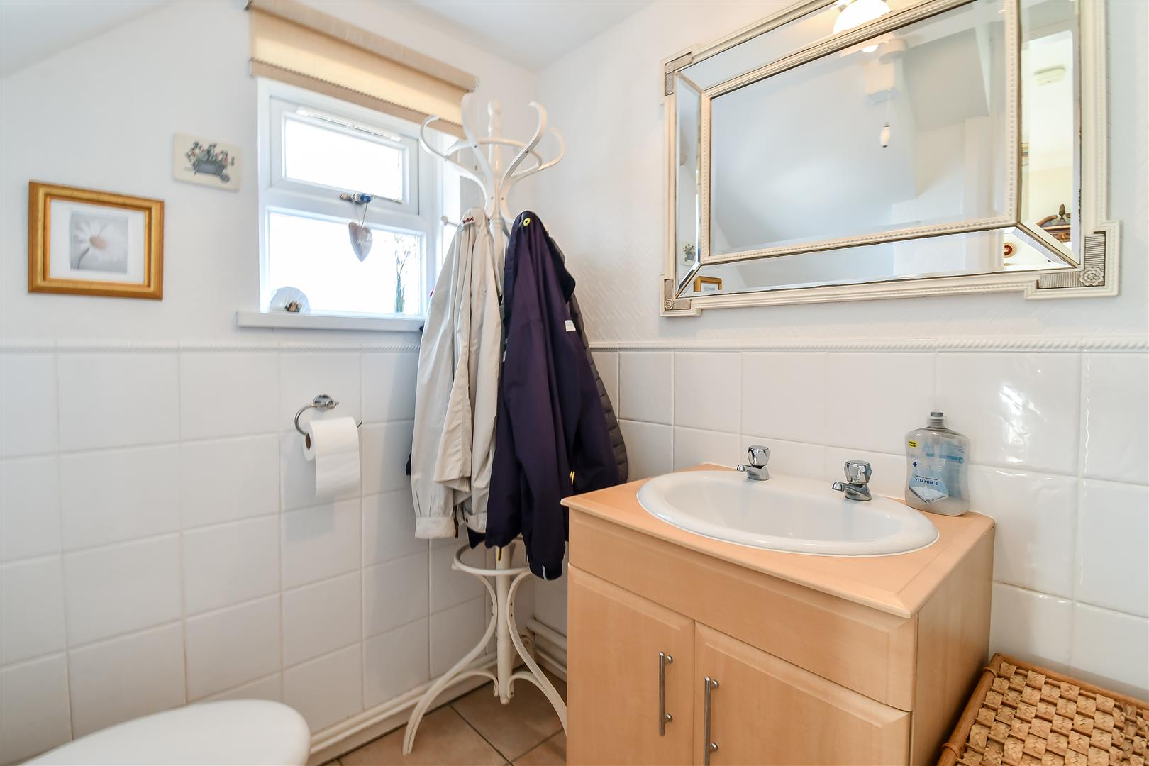 Smoothly plastered ceiling, papered walls. Ceramic tiled flooring. Porcelain tiled splashback's. Wall mounted towel rail. UPVC double glazed window with obscured glass to side Vanity wash hand basin. Close coupled toilet. Wood panelled door leading through to the entrance hallway.