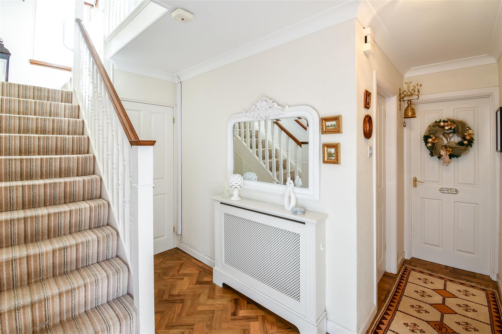 Smoothly plastered ceiling with coving, papered walls. Original parquet flooring. Wall mounted radiator. Fitted carpet staircase rising to the first floor. UPVC double glazed front door with obscured glass insert. Wood panelled doors leading through to living room, dining room and kitchen / breakfast. A further wooden door leading through to a W.C cloakroom.